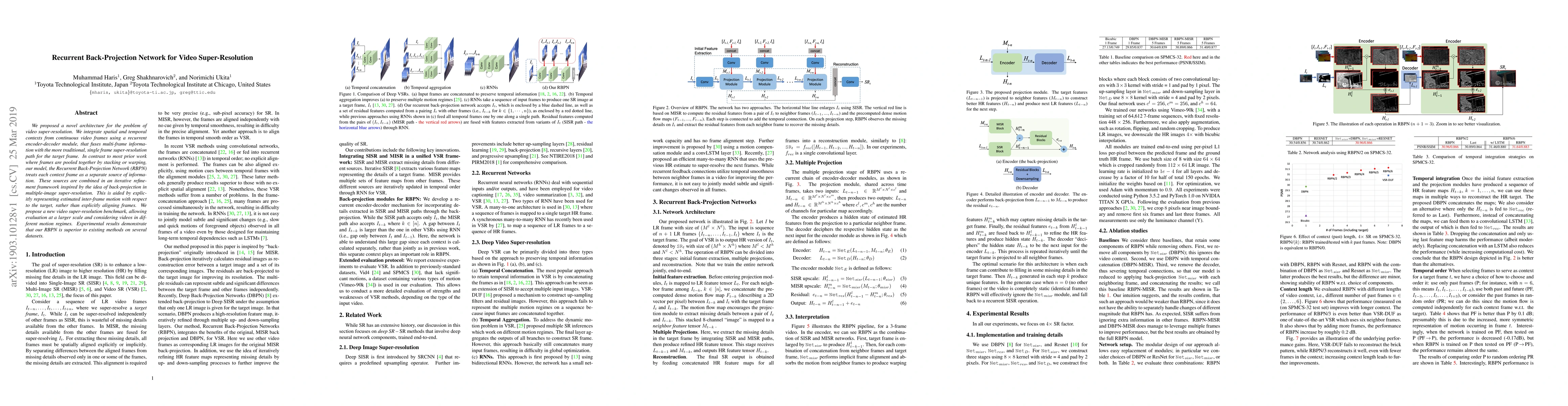 The Recurrent Back-Projection Network (RBPN) proposes a novel architecture for video super-resolution, integrating spatial and temporal contexts through a recurrent encoder-decoder module that iteratively refines frames using multi-frame information. RBPN outperforms existing methods by explicitly representing inter-frame motion rather than aligning frames.