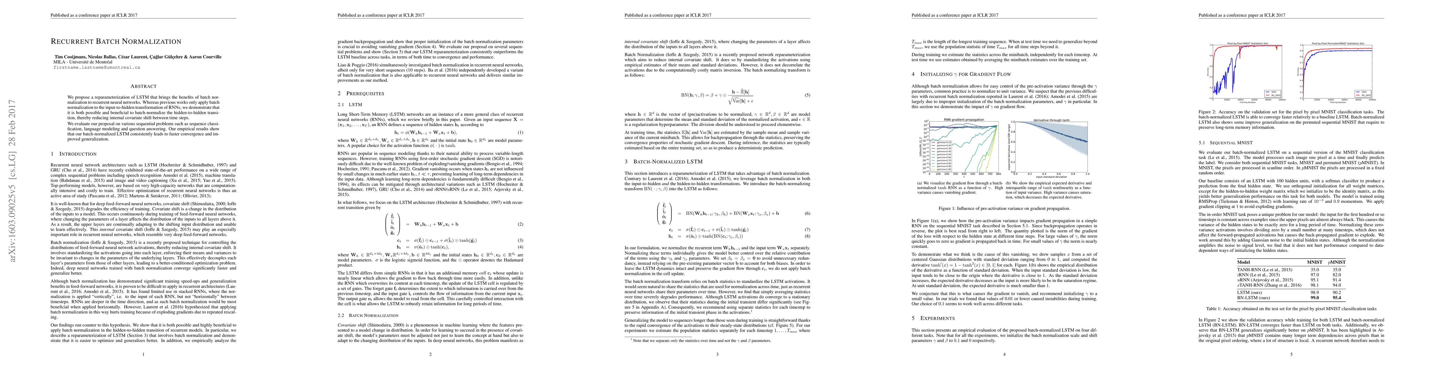 Title: Recurrent Batch Normalization Summary: This paper reparameterizes LSTM to apply batch normalization to both the input-to-hidden and hidden-to-hidden transitions, reducing internal covariate shift and improving convergence and generalization across various sequential tasks.