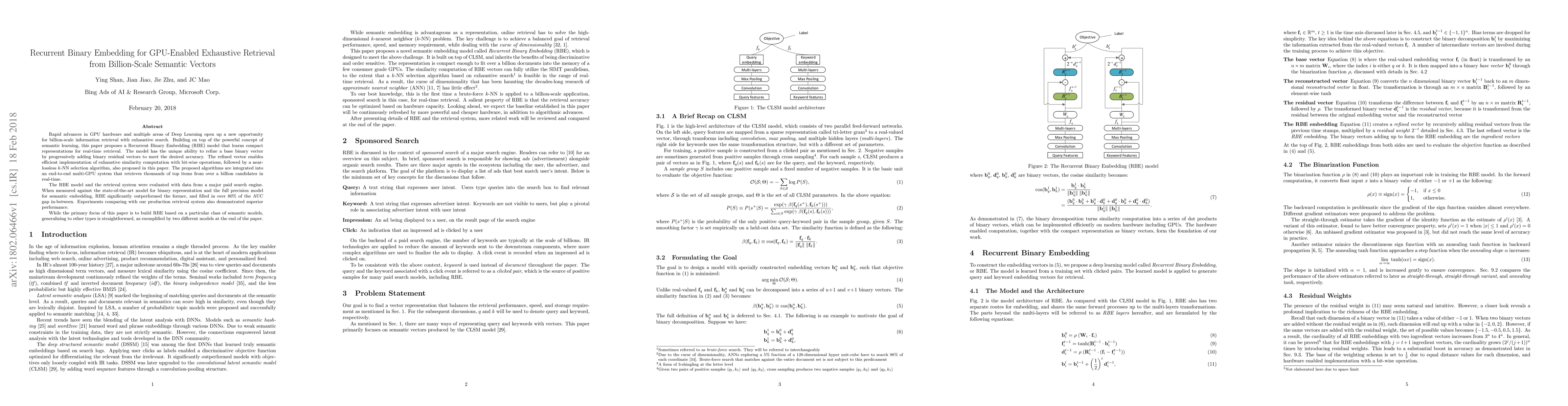 Rapid advances in GPU hardware and multiple areas of Deep Learning open up a new opportunity for billion-scale information retrieval with exhaustive search. Building on top of the powerful concept of semantic learning, this paper proposes a Recurrent Binary Embedding (RBE) model that learns compact representations for real-time retrieval. The model has the unique ability to refine a base binary vector by progressively adding binary residual vectors to meet the desired accuracy. The refined vector enables efficient implementation of exhaustive similarity computation with bit-wise operations, followed by a near- lossless k-NN selection algorithm, also proposed in this paper. The proposed algorithms are integrated into an end-to-end multi-GPU system that retrieves thousands of top items from over a billion candidates in real-time. The RBE model and the retrieval system were evaluated with data from a major paid search engine. When measured against the state-of-the-art model for binary representation and the full precision model for semantic embedding, RBE significantly outperformed the former, and filled in over 80% of the AUC gap in-between. Experiments comparing with our production retrieval system also demonstrated superior performance. While the primary focus of this paper is to build RBE based on a particular class of semantic models, generalizing to other types is straightforward, as exemplified by two different models at the end of the paper.