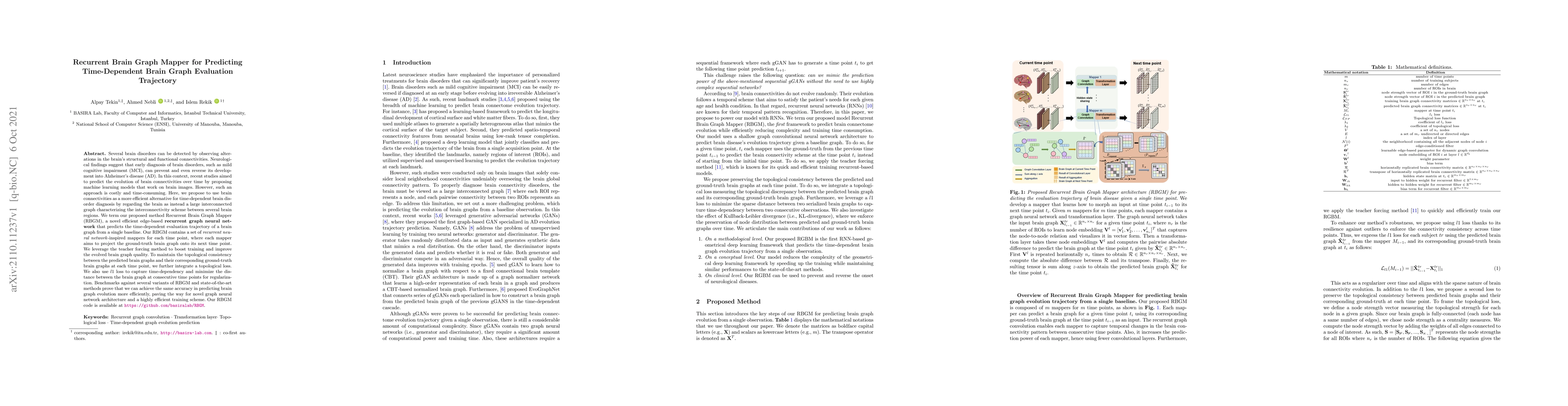Researchers propose a new method called Recurrent Brain Graph Mapper to predict how brain connectivity changes over time, aiming to detect brain disorders more efficiently than current methods. Their approach uses graph neural networks to analyze brain images and achieve accurate predictions while reducing training time.