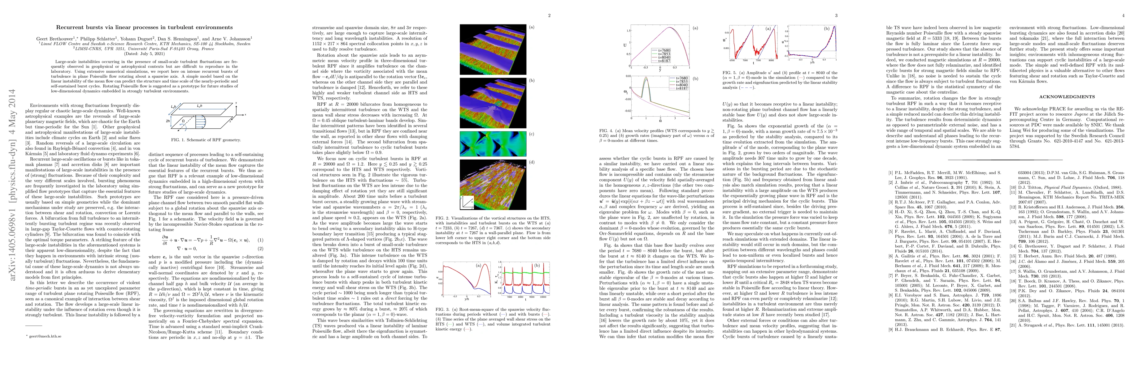 This paper reports on intense recurrent bursts of turbulence in rotating plane Poiseuille flow, using numerical simulations to demonstrate their predictability via a linear instability model. The study suggests rotating Poiseuille flow as a prototype for exploring low-dimensional dynamics within strongly turbulent environments.