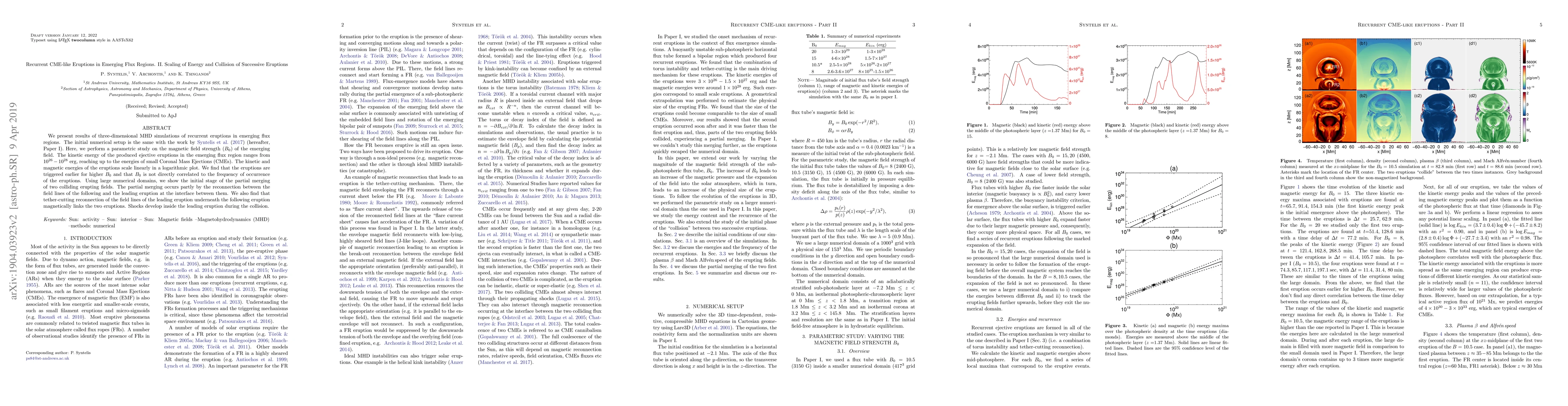 We present results of three-dimensional MHD simulations of recurrent eruptions in emerging flux regions. The initial numerical setup is the same with the work by Syntelis et al. 2017 (hereafter, Paper I). Here, we perform a parametric study on the magnetic field strength ($B_0$) of the emerging field. The kinetic energy of the produced ejective eruptions in the emerging flux region ranges from $10^{26}-10^{28}$ erg, reaching up to the energies of small Coronal Mass Ejections (CMEs). The kinetic and magnetic energies of the eruptions scale linearly in a logarithmic plot. We find that the eruptions are triggered earlier for higher $B_0$ and that $B_0$ is not directly correlated to the frequency of occurrence of the eruptions. Using large numerical domains, we show the initial stage of the partial merging of two colliding erupting fields. The partial merging occurs partly by the reconnection between the field lines of the following and the leading eruption at the interface between them. We also find that tether-cutting reconnection of the field lines of the leading eruption underneath the following eruption magnetically links the two eruptions. Shocks develop inside the leading eruption during the collision.