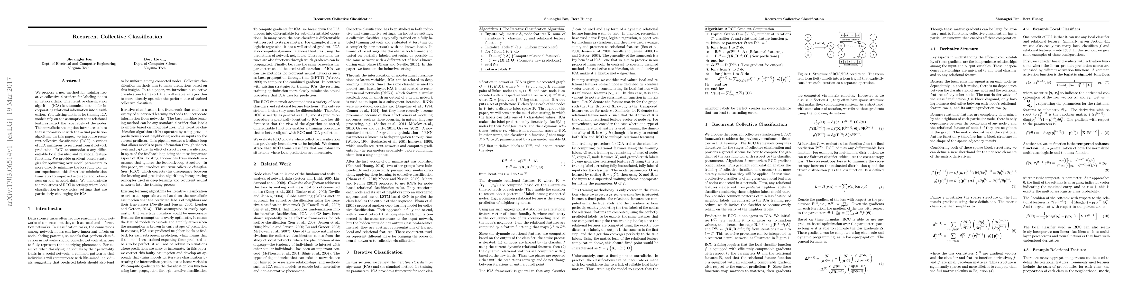 This paper introduces recurrent collective classification (RCC), a method for iterative collective classification in network data that directly minimizes the loss function, improving accuracy and robustness compared to existing iterative classification algorithms. RCC accommodates any differentiable local classifier and relational feature functions, demonstrating enhanced performance in noisy classification settings.