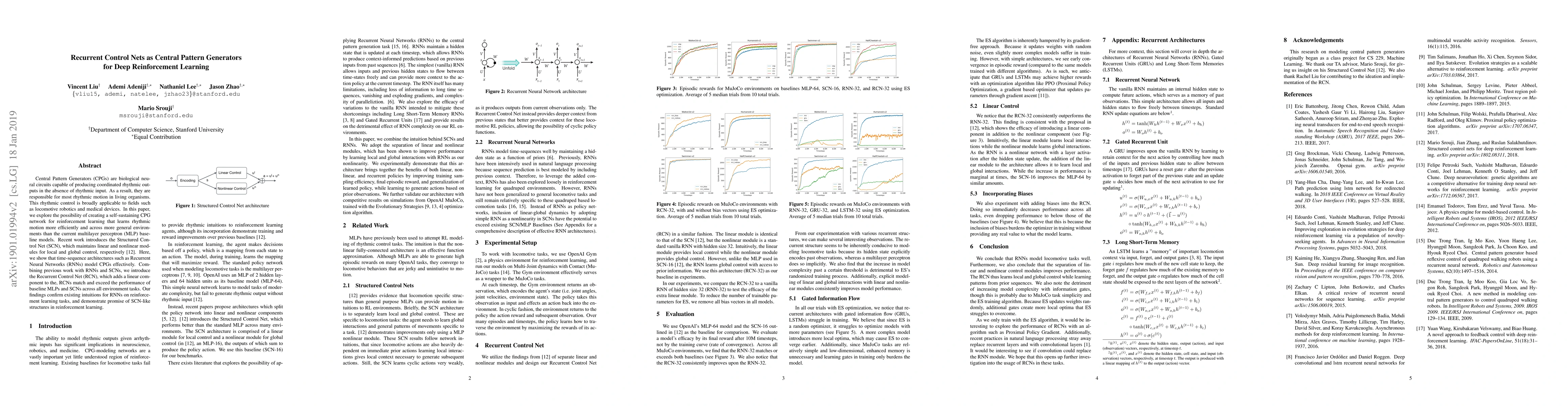 Central Pattern Generators (CPGs) are biological neural circuits capable of producing coordinated rhythmic outputs in the absence of rhythmic input. As a result, they are responsible for most rhythmic motion in living organisms. This rhythmic control is broadly applicable to fields such as locomotive robotics and medical devices. In this paper, we explore the possibility of creating a self-sustaining CPG network for reinforcement learning that learns rhythmic motion more efficiently and across more general environments than the current multilayer perceptron (MLP) baseline models. Recent work introduces the Structured Control Net (SCN), which maintains linear and nonlinear modules for local and global control, respectively. Here, we show that time-sequence architectures such as Recurrent Neural Networks (RNNs) model CPGs effectively. Combining previous work with RNNs and SCNs, we introduce the Recurrent Control Net (RCN), which adds a linear component to the, RCNs match and exceed the performance of baseline MLPs and SCNs across all environment tasks. Our findings confirm existing intuitions for RNNs on reinforcement learning tasks, and demonstrate promise of SCN-like structures in reinforcement learning.
