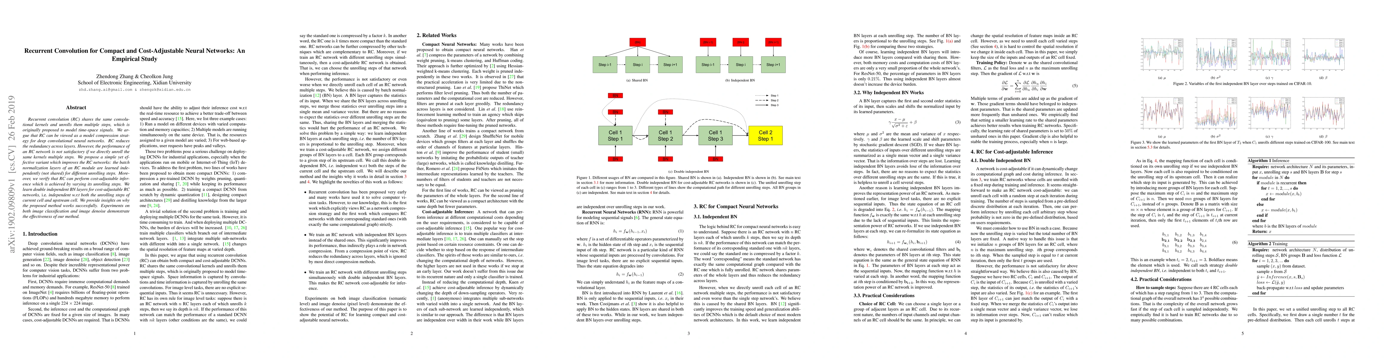 Recurrent convolution (RC) shares the same convolutional kernels and unrolls them multiple steps, which is originally proposed to model time-space signals. We argue that RC can be viewed as a model compression strategy for deep convolutional neural networks. RC reduces the redundancy across layers. However, the performance of an RC network is not satisfactory if we directly unroll the same kernels multiple steps. We propose a simple yet effective variant which improves the RC networks: the batch normalization layers of an RC module are learned independently (not shared) for different unrolling steps. Moreover, we verify that RC can perform cost-adjustable inference which is achieved by varying its unrolling steps. We learn double independent BN layers for cost-adjustable RC networks, i.e. independent w.r.t both the unrolling steps of current cell and upstream cell. We provide insights on why the proposed method works successfully. Experiments on both image classification and image denoise demonstrate the effectiveness of our method.