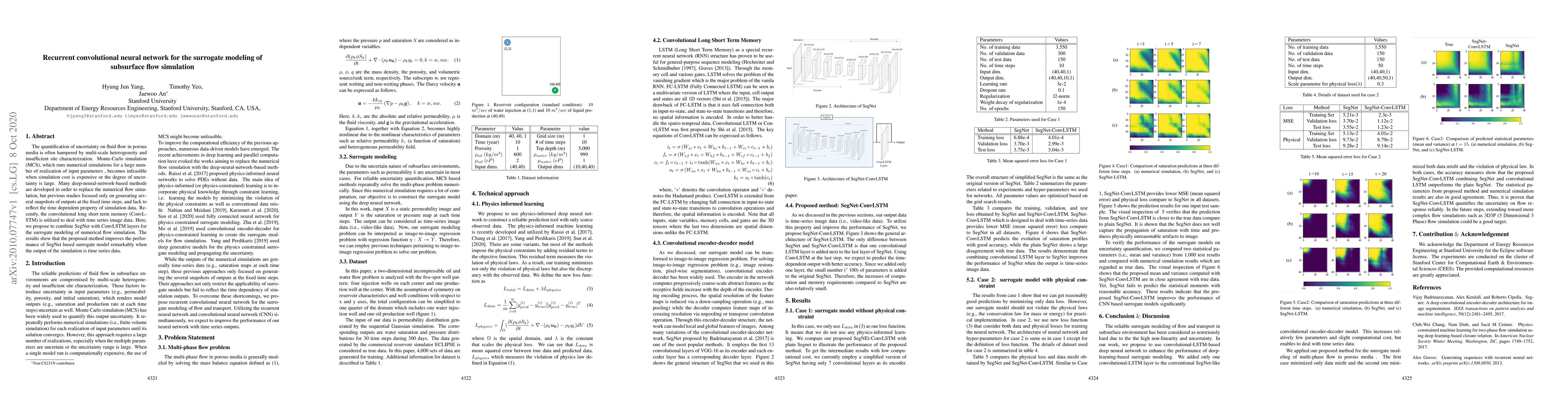 This paper proposes a recurrent convolutional neural network combining SegNet with ConvLSTM layers for surrogate modeling of subsurface flow simulations. The method effectively captures time-dependent properties, significantly improving the performance of traditional SegNet-based models for time series simulation data.