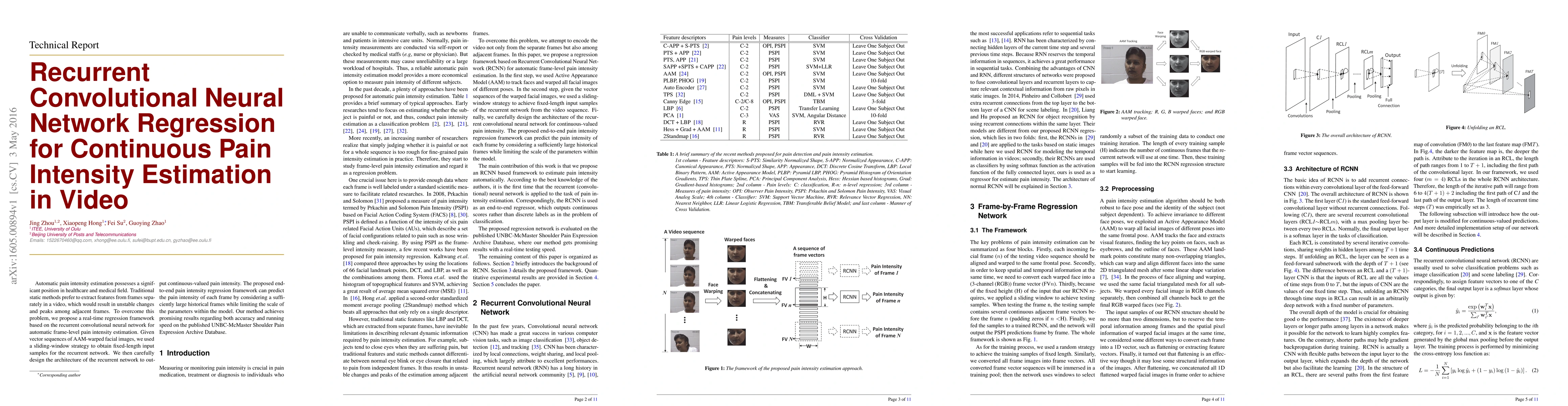 This paper proposes a recurrent convolutional neural network (RCNN) regression framework for continuous pain intensity estimation in video. The method uses a sliding-window strategy to process vector sequences of AAM-warped facial images, achieving accurate and fast predictions of pain intensity by leveraging historical frame data.