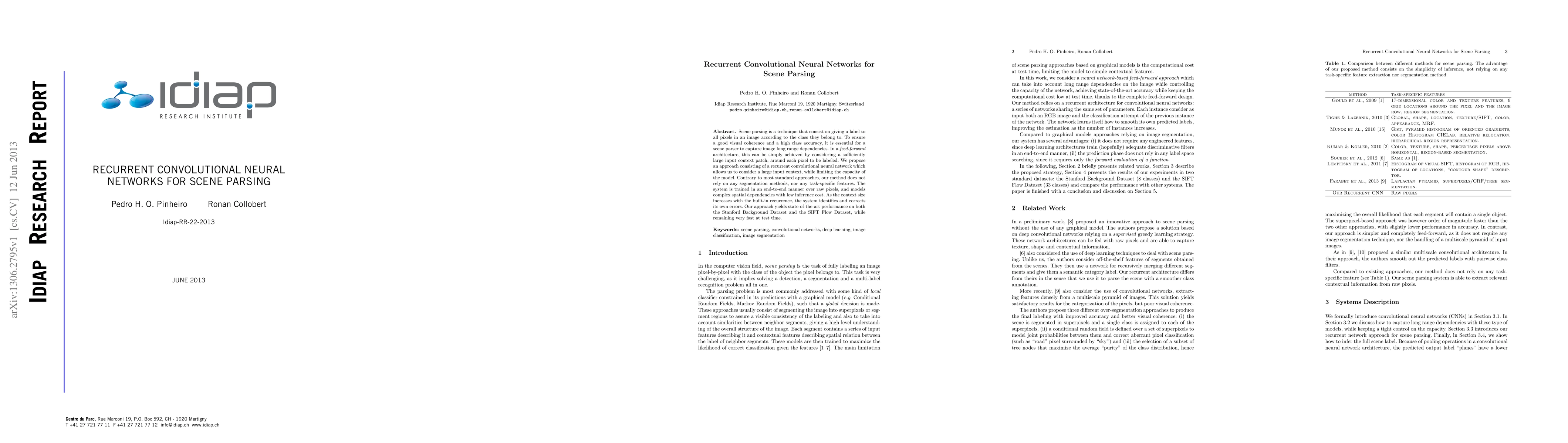 This paper proposes a recurrent convolutional neural network for scene parsing, achieving high accuracy and visual coherence without relying on segmentation methods. The model captures long-range dependencies through built-in recurrence, leading to state-of-the-art performance on benchmark datasets while maintaining fast inference speeds.