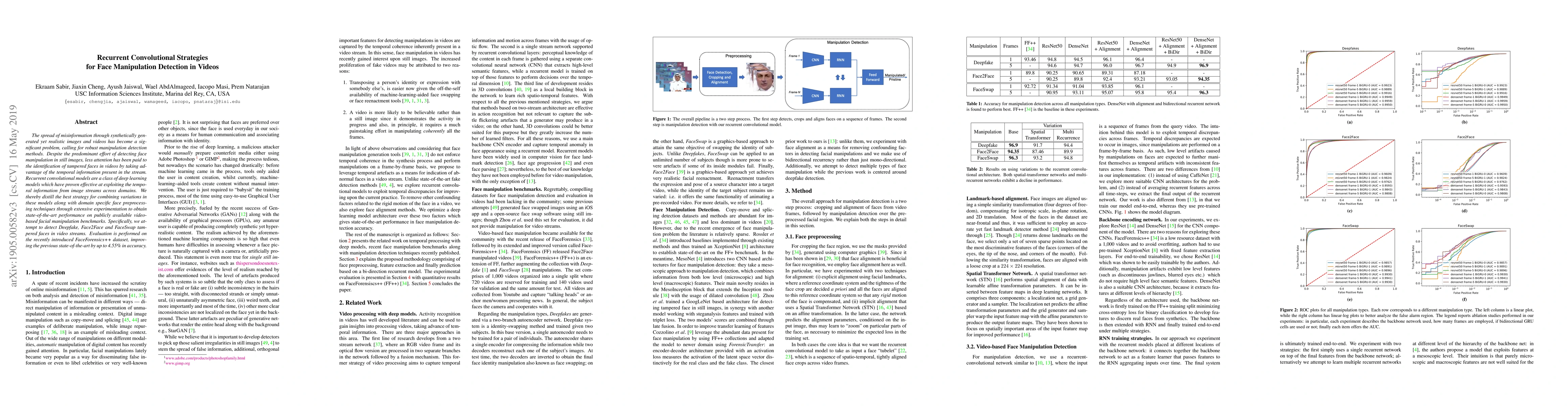 The spread of misinformation through synthetically generated yet realistic images and videos has become a significant problem, calling for robust manipulation detection methods. Despite the predominant effort of detecting face manipulation in still images, less attention has been paid to the identification of tampered faces in videos by taking advantage of the temporal information present in the stream. Recurrent convolutional models are a class of deep learning models which have proven effective at exploiting the temporal information from image streams across domains. We thereby distill the best strategy for combining variations in these models along with domain specific face preprocessing techniques through extensive experimentation to obtain state-of-the-art performance on publicly available video-based facial manipulation benchmarks. Specifically, we attempt to detect Deepfake, Face2Face and FaceSwap tampered faces in video streams. Evaluation is performed on the recently introduced FaceForensics++ dataset, improving the previous state-of-the-art by up to 4.55% in accuracy.