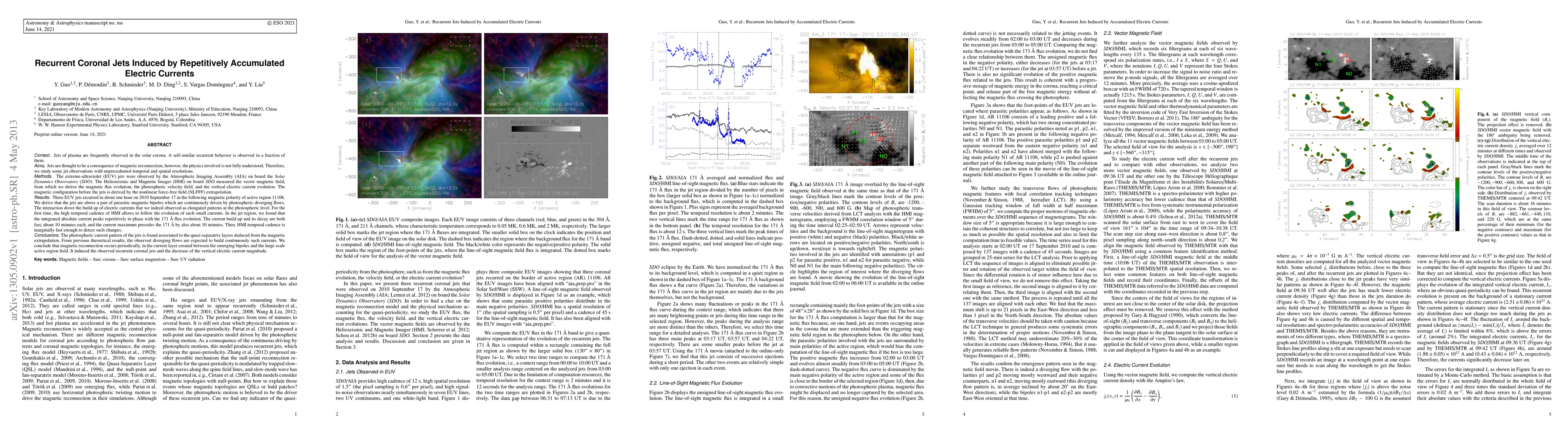 Three extreme-ultraviolet (EUV) jets recurred in about one hour on 2010 September 17 in the following magnetic polarity of active region 11106. The EUV jets were observed by the Atmospheric Imaging Assembly (AIA) on board the Solar Dynamics Observatory (SDO). The Helioseismic and Magnetic Imager (HMI) on board SDO measured the vector magnetic field, from which we derive the magnetic flux evolution, the photospheric velocity field, and the vertical electric current evolution. The magnetic configuration before the jets is derived by the nonlinear force-free field (NLFFF) extrapolation. We derive that the jets are above a pair of parasitic magnetic bipoles which are continuously driven by photospheric diverging flows. The interaction drove the build up of electric currents that we indeed observed as elongated patterns at the photospheric level. For the first time, the high temporal cadence of HMI allows to follow the evolution of such small currents. In the jet region, we found that the integrated absolute current peaks repetitively in phase with the 171 A flux evolution. The current build up and its decay are both fast, about 10 minutes each, and the current maximum precedes the 171 A by also about 10 minutes. Then, HMI temporal cadence is marginally fast enough to detect such changes. The photospheric current pattern of the jets is found associated to the quasi-separatrix layers deduced from the magnetic extrapolation. From previous theoretical results, the observed diverging flows are expected to build continuously such currents. We conclude that magnetic reconnection occurs periodically, in the current layer created between the emerging bipoles and the large scale active region field. It induced the observed recurrent coronal jets and the decrease of the vertical electric current magnitude.