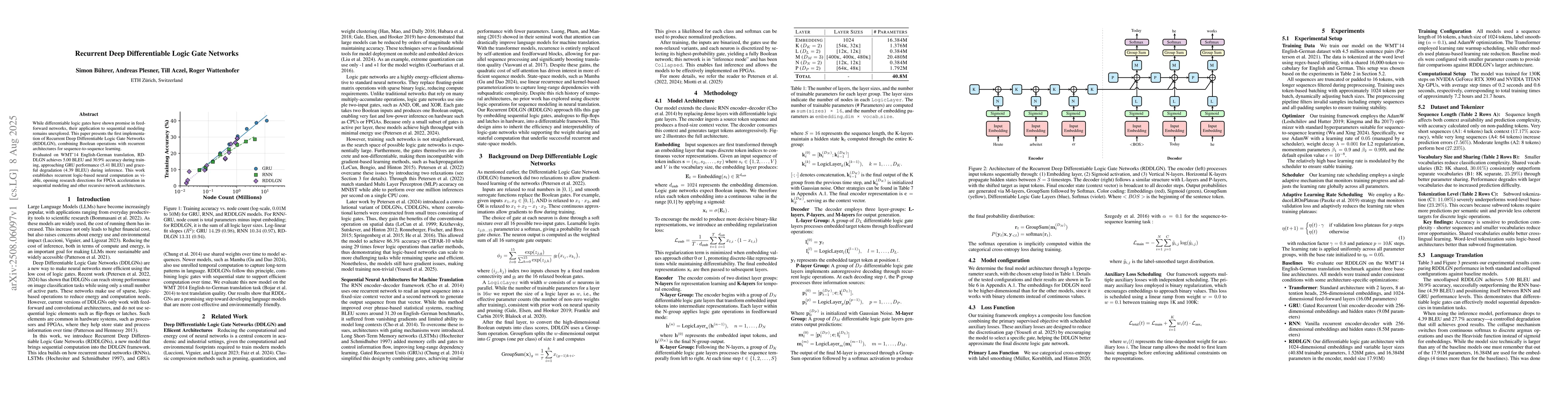 While differentiable logic gates have shown promise in feedforward networks, their application to sequential modeling remains unexplored. This paper presents the first implementation of Recurrent Deep Differentiable Logic Gate Networks (RDDLGN), combining Boolean operations with recurrent architectures for sequence-to-sequence learning. Evaluated on WMT'14 English-German translation, RDDLGN achieves 5.00 BLEU and 30.9\% accuracy during training, approaching GRU performance (5.41 BLEU) and graceful degradation (4.39 BLEU) during inference. This work establishes recurrent logic-based neural computation as viable, opening research directions for FPGA acceleration in sequential modeling and other recursive network architectures.