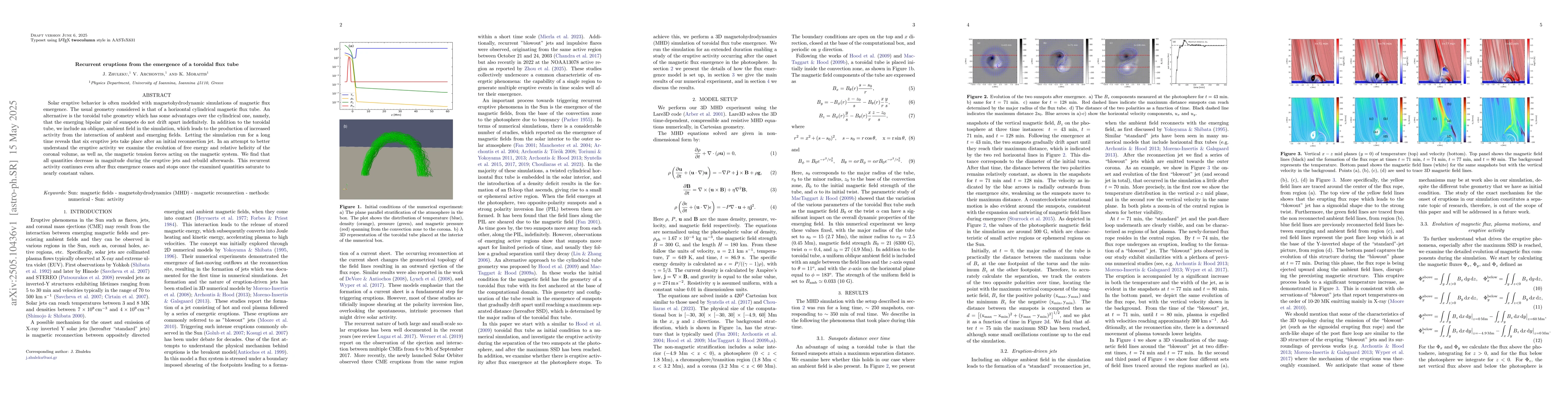 This work distinguishes itself by focusing on the toroidal flux tube geometry, which prevents indefinite drift of sunspot pairs, and by demonstrating recurrent eruptions driven by the interaction of ambient and emerging fields.