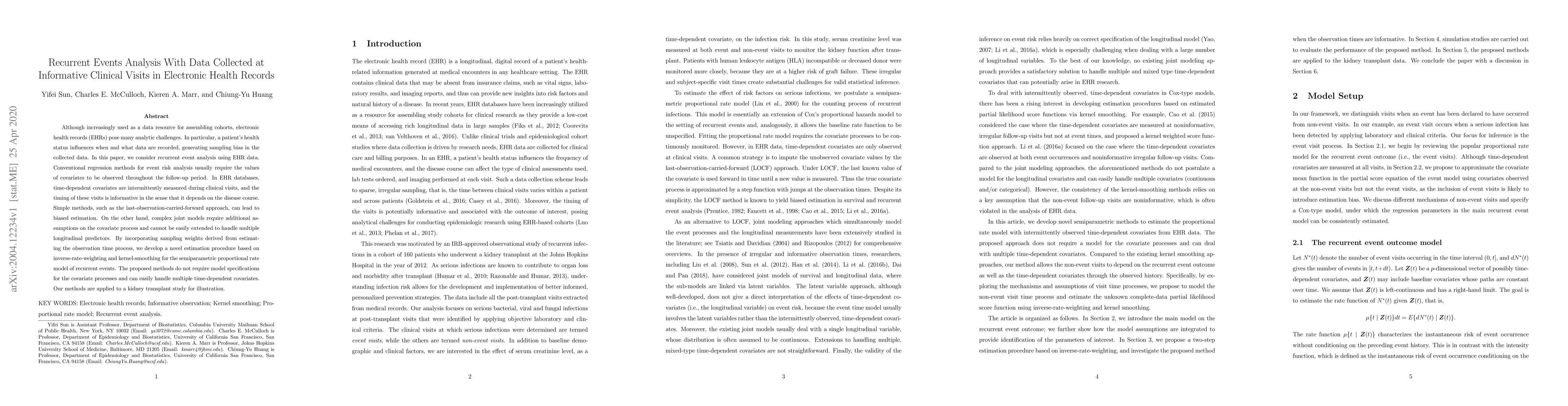 This paper develops a novel estimation procedure for analyzing recurrent events in electronic health records (EHRs) using inverse-rate-weighting and kernel-smoothing, addressing the bias from informative clinical visit timings without requiring complex joint models. The method is demonstrated through a kidney transplant study.