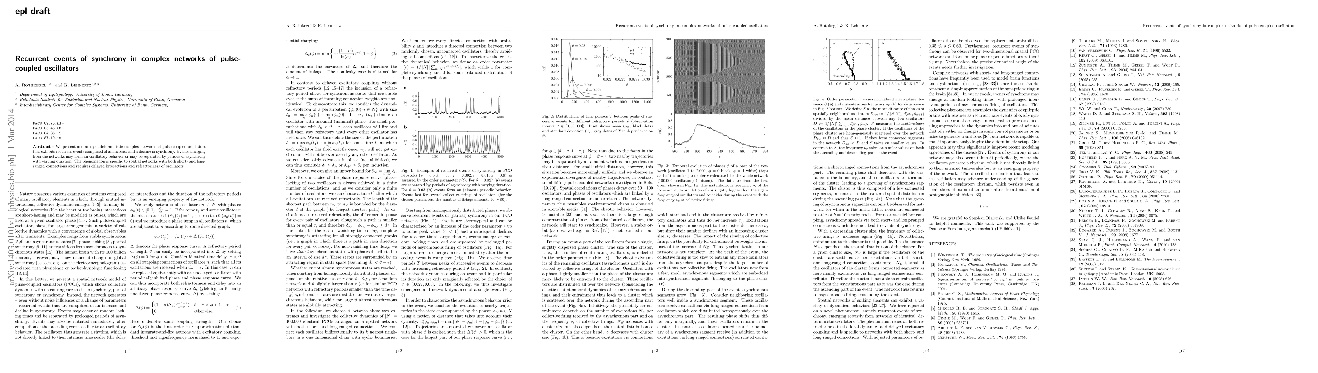 We present and analyze deterministic complex networks of pulse-coupled oscillators that exhibits recurrent events comprised of an increase and a decline in synchrony. Events emerging from the networks may form an oscillatory behavior or may be separated by periods of asynchrony with varying duration. The phenomenon is specific to spatial networks with both short- and long-ranged connections and requires delayed interactions and refractoriness of oscillators.