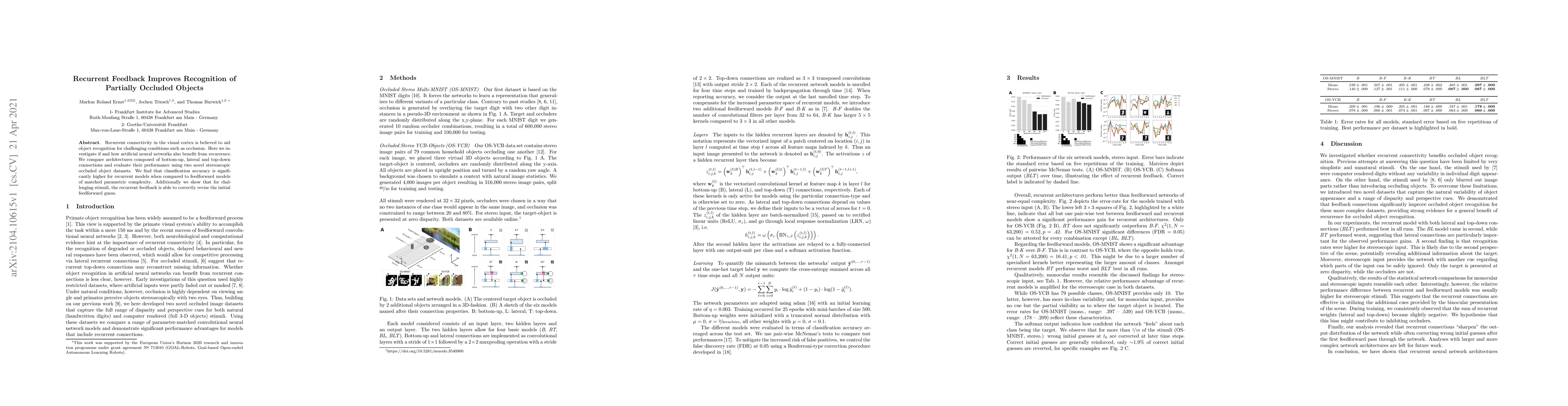 Recurrent connectivity in the visual cortex is believed to aid object recognition for challenging conditions such as occlusion. Here we investigate if and how artificial neural networks also benefit from recurrence. We compare architectures composed of bottom-up, lateral and top-down connections and evaluate their performance using two novel stereoscopic occluded object datasets. We find that classification accuracy is significantly higher for recurrent models when compared to feedforward models of matched parametric complexity. Additionally we show that for challenging stimuli, the recurrent feedback is able to correctly revise the initial feedforward guess.