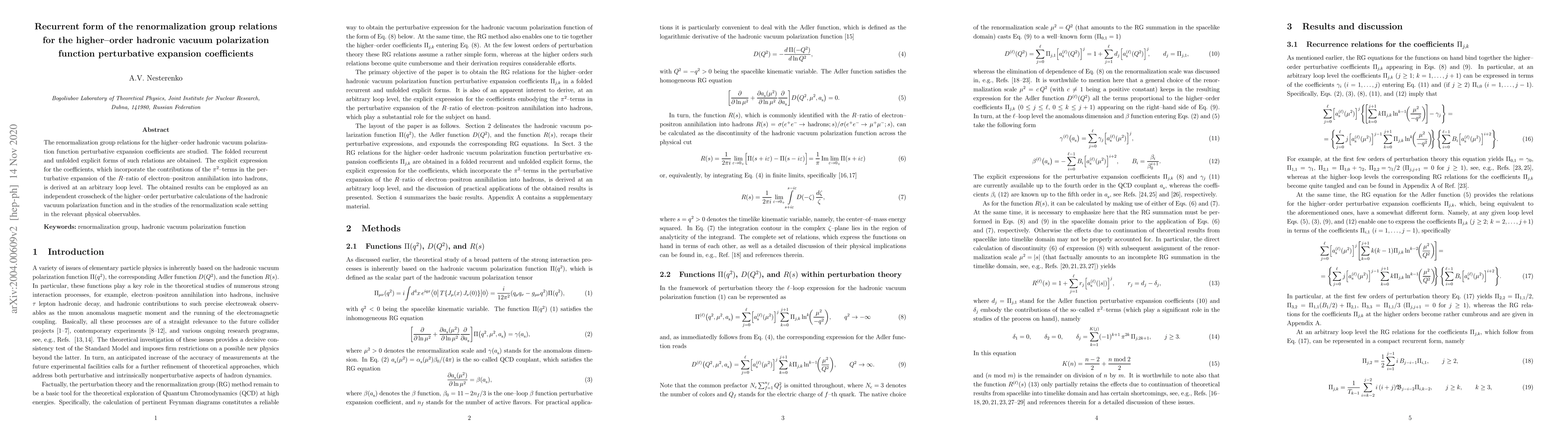The renormalization group relations for the higher-order hadronic vacuum polarization function perturbative expansion coefficients are studied. The folded recurrent and unfolded explicit forms of such relations are obtained. The explicit expression for the coefficients, which incorporate the contributions of the $\pi^{2}$-terms in the perturbative expansion of the R-ratio of electron-positron annihilation into hadrons, is derived at an arbitrary loop level. The obtained results can be employed as an independent crosscheck of the higher-order perturbative calculations of the hadronic vacuum polarization function and in the studies of the renormalization scale setting in the relevant physical observables.