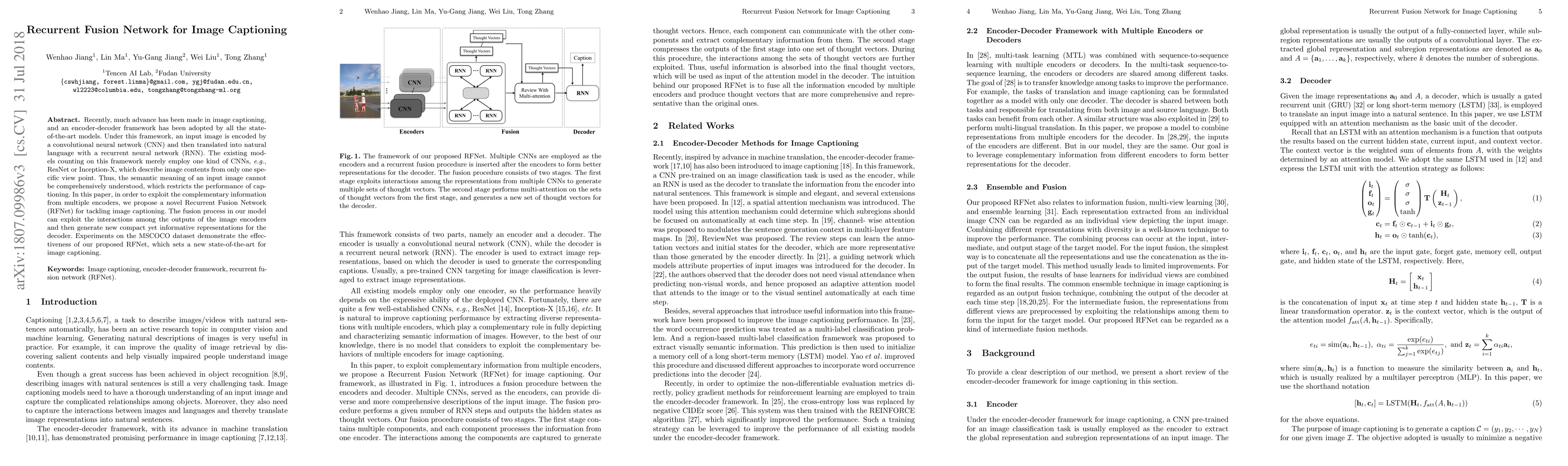 The paper proposes a Recurrent Fusion Network (RFNet) to enhance image captioning by integrating outputs from multiple convolutional neural networks (CNNs) to provide a more comprehensive understanding of image contents. RFNet sets a new state-of-the-art in image captioning performance on the MSCOCO dataset.