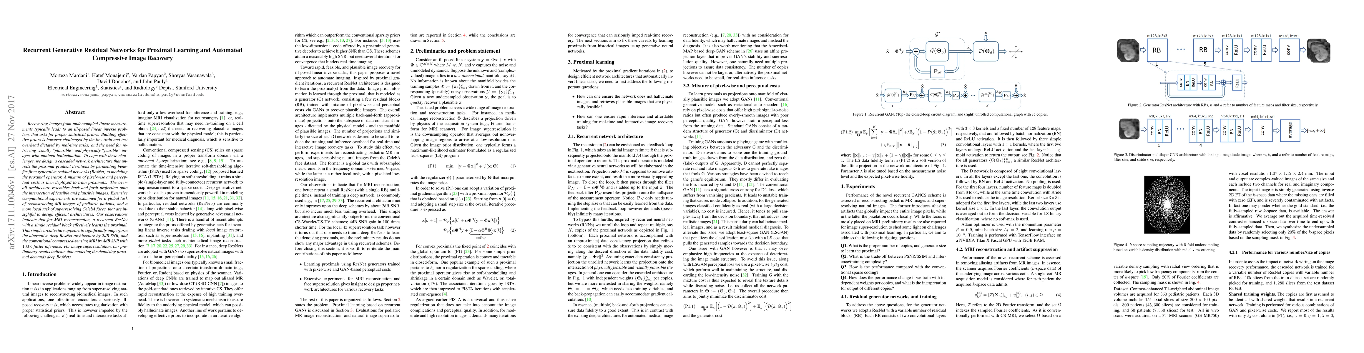 Recovering images from undersampled linear measurements typically leads to an ill-posed linear inverse problem, that asks for proper statistical priors. Building effective priors is however challenged by the low train and test overhead dictated by real-time tasks; and the need for retrieving visually "plausible" and physically "feasible" images with minimal hallucination. To cope with these challenges, we design a cascaded network architecture that unrolls the proximal gradient iterations by permeating benefits from generative residual networks (ResNet) to modeling the proximal operator. A mixture of pixel-wise and perceptual costs is then deployed to train proximals. The overall architecture resembles back-and-forth projection onto the intersection of feasible and plausible images. Extensive computational experiments are examined for a global task of reconstructing MR images of pediatric patients, and a more local task of superresolving CelebA faces, that are insightful to design efficient architectures. Our observations indicate that for MRI reconstruction, a recurrent ResNet with a single residual block effectively learns the proximal. This simple architecture appears to significantly outperform the alternative deep ResNet architecture by 2dB SNR, and the conventional compressed-sensing MRI by 4dB SNR with 100x faster inference. For image superresolution, our preliminary results indicate that modeling the denoising proximal demands deep ResNets.
