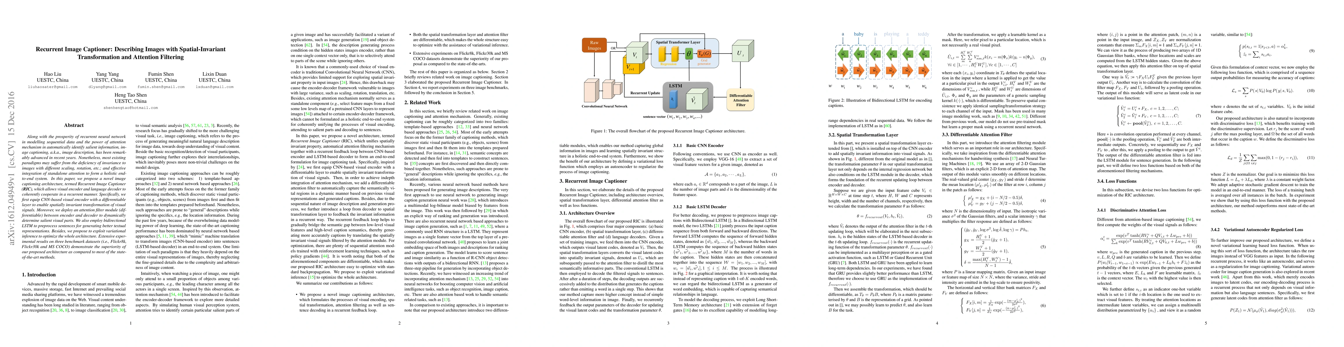 A new image captioning architecture called Recurrent Image Captioner (RIC) improves upon existing methods with spatially invariant transformation and attention filtering, achieving superior results on benchmark datasets.