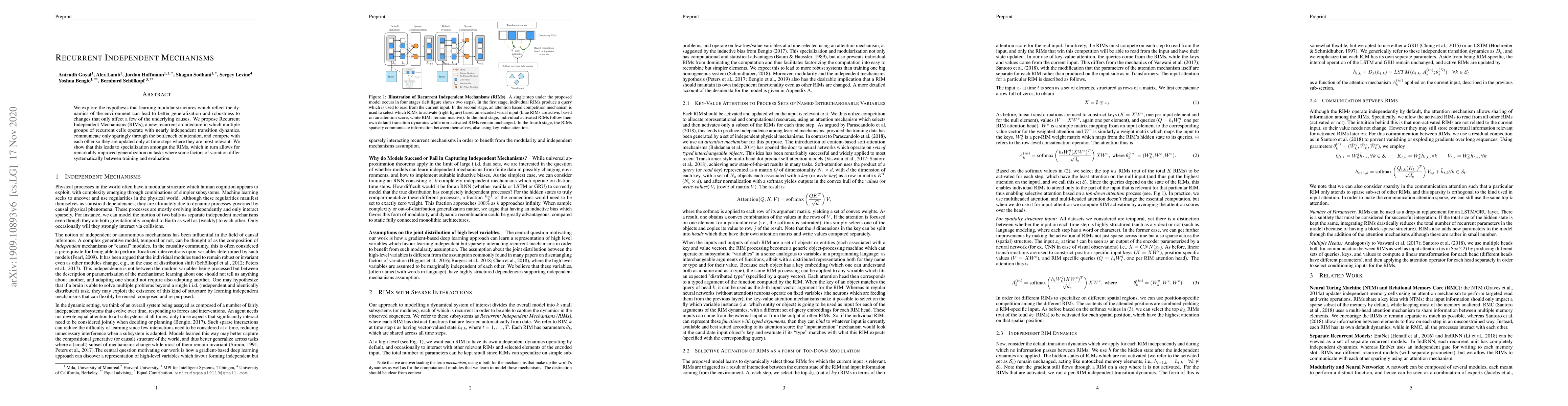 Learning modular structures which reflect the dynamics of the environment can lead to better generalization and robustness to changes which only affect a few of the underlying causes. We propose Recurrent Independent Mechanisms (RIMs), a new recurrent architecture in which multiple groups of recurrent cells operate with nearly independent transition dynamics, communicate only sparingly through the bottleneck of attention, and are only updated at time steps where they are most relevant. We show that this leads to specialization amongst the RIMs, which in turn allows for dramatically improved generalization on tasks where some factors of variation differ systematically between training and evaluation.