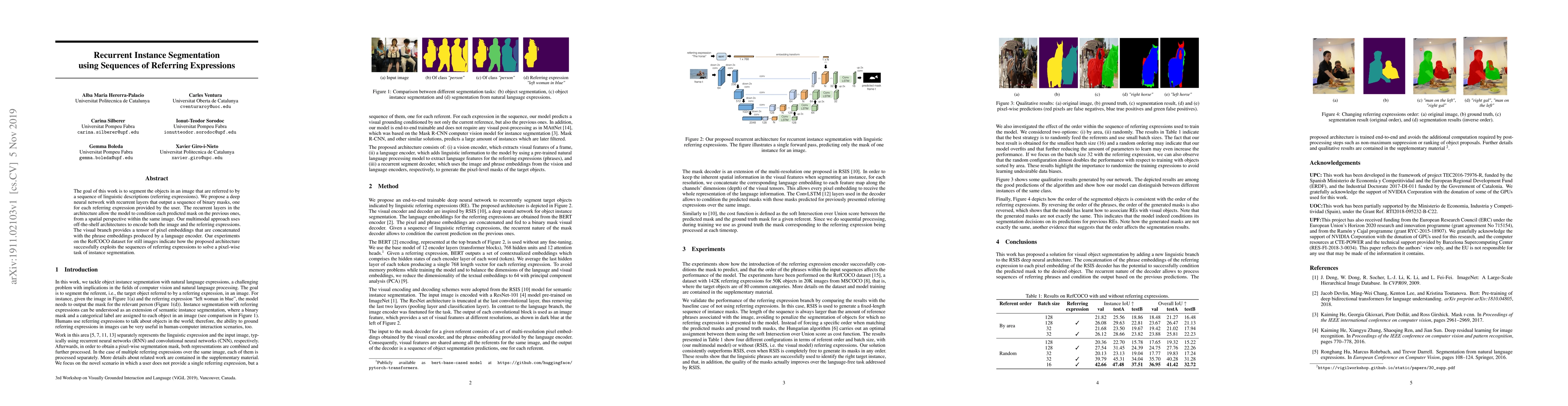This paper proposes a deep neural network with recurrent layers to segment objects referred to by a sequence of linguistic descriptions, outputting a sequence of binary masks. The recurrent architecture conditions each mask on the previous ones, leveraging both image and language encoders for effective multimodal processing.