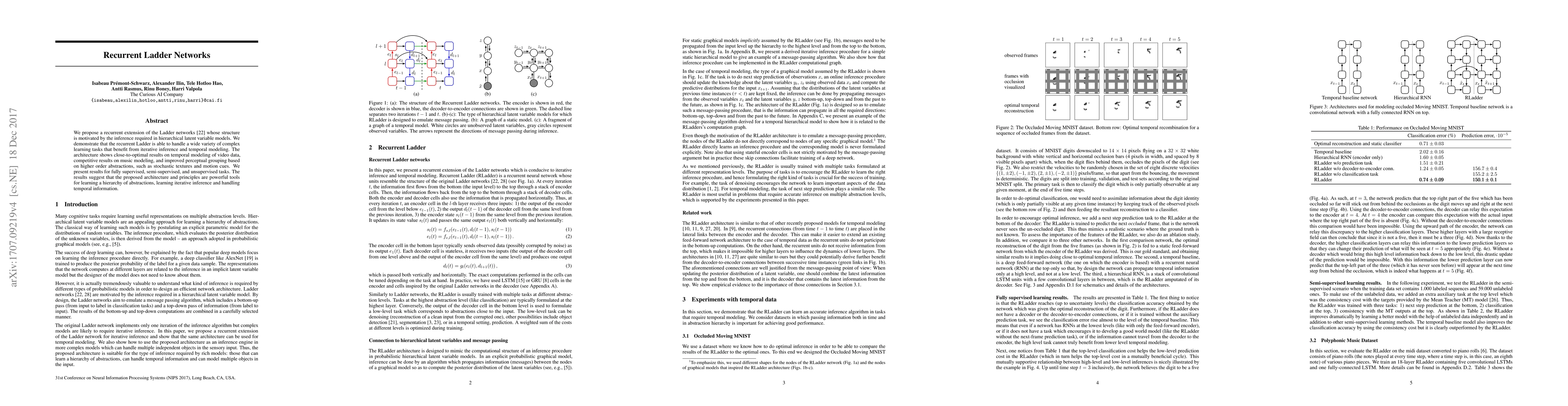 The paper introduces a recurrent extension of Ladder networks, demonstrating its effectiveness in handling complex learning tasks through iterative inference and temporal modeling. The architecture achieves optimal results in video data temporal modeling, competitive results in music modeling, and enhanced perceptual grouping, suggesting it is a powerful tool for hierarchical abstraction learning.