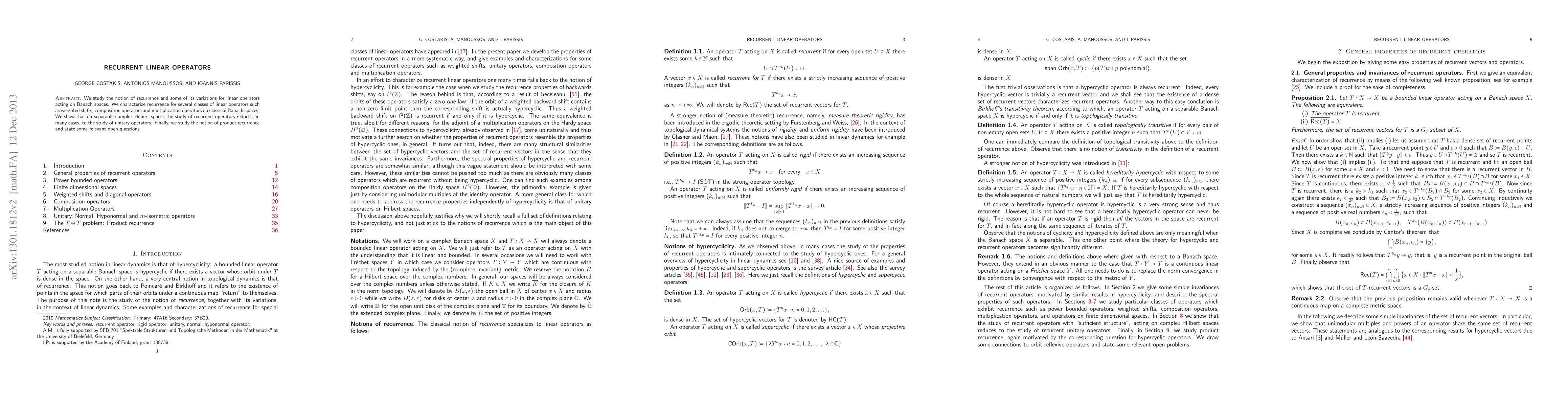 This paper studies recurrence in linear operators on Banach spaces, characterizing recurrence for weighted shifts, composition operators, and multiplication operators, and shows that separable complex Hilbert spaces reduce to the study of unitary operators.