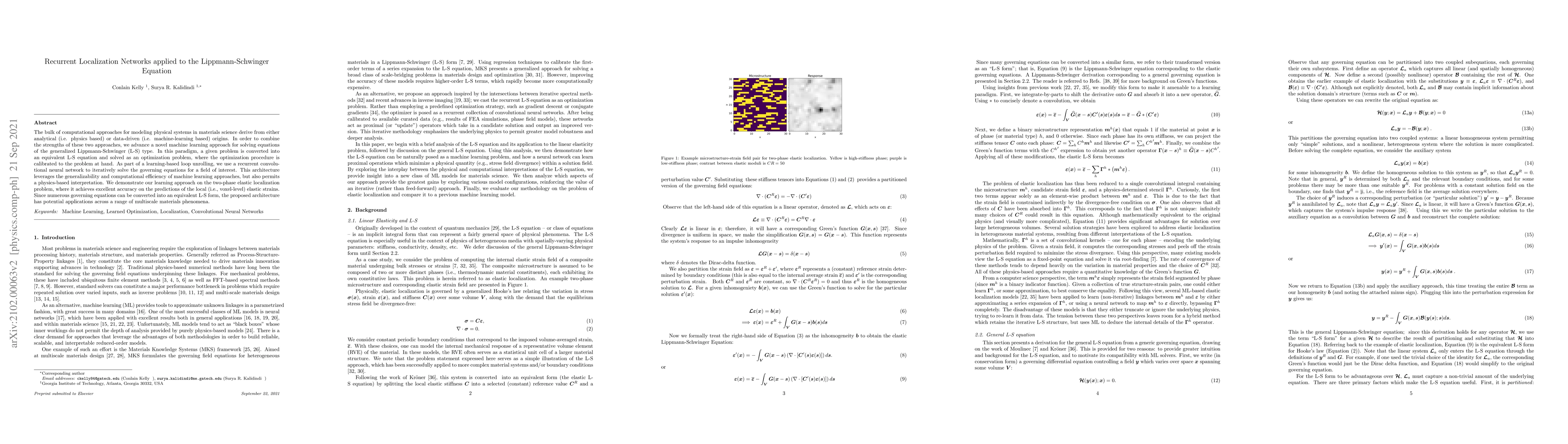 The bulk of computational approaches for modeling physical systems in materials science derive from either analytical (i.e. physics based) or data-driven (i.e. machine-learning based) origins. In order to combine the strengths of these two approaches, we advance a novel machine learning approach for solving equations of the generalized Lippmann-Schwinger (L-S) type. In this paradigm, a given problem is converted into an equivalent L-S equation and solved as an optimization problem, where the optimization procedure is calibrated to the problem at hand. As part of a learning-based loop unrolling, we use a recurrent convolutional neural network to iteratively solve the governing equations for a field of interest. This architecture leverages the generalizability and computational efficiency of machine learning approaches, but also permits a physics-based interpretation. We demonstrate our learning approach on the two-phase elastic localization problem, where it achieves excellent accuracy on the predictions of the local (i.e., voxel-level) elastic strains. Since numerous governing equations can be converted into an equivalent L-S form, the proposed architecture has potential applications across a range of multiscale materials phenomena.