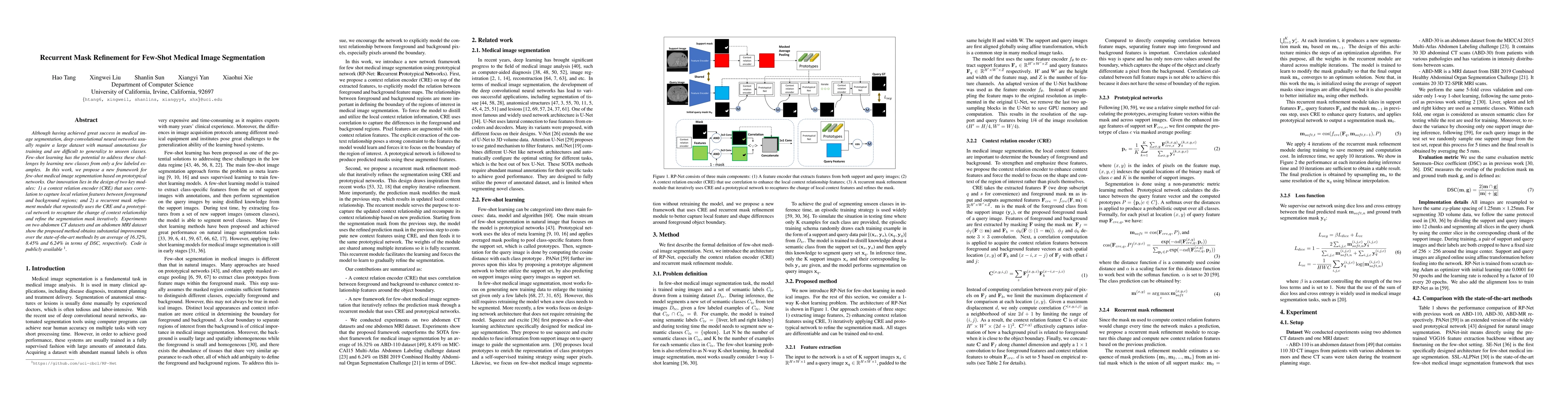 This paper proposes a recurrent mask refinement framework for few-shot medical image segmentation using prototypical networks, featuring a context relation encoder and a recurrent mask refinement module for iterative segmentation mask improvement. The method demonstrates significant improvements over state-of-the-art methods on multiple datasets.