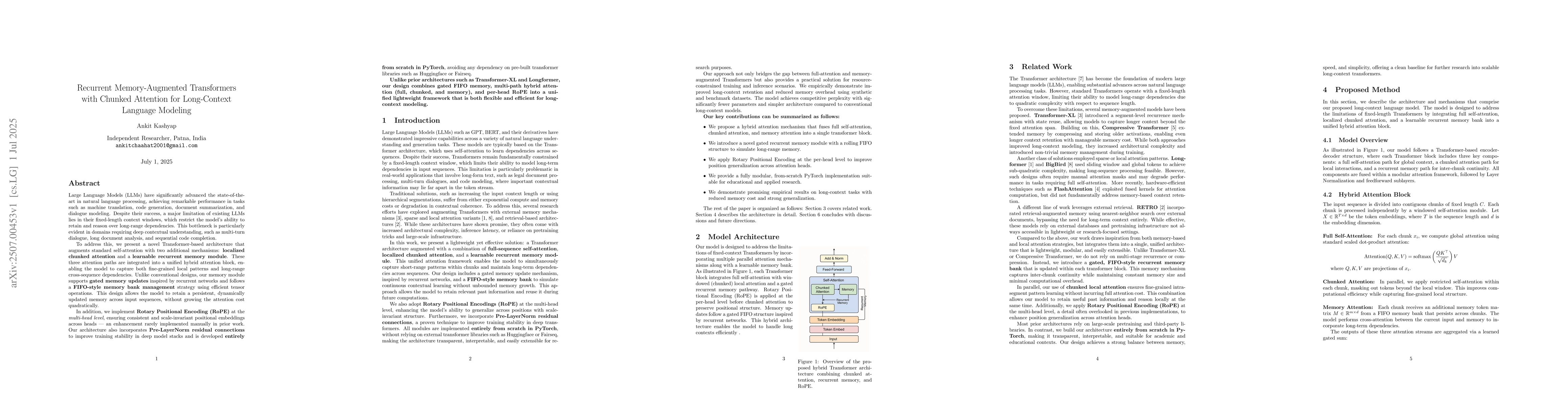 The paper introduces a Transformer architecture for long-context language modeling, integrating global attention with chunked local attention and a gated FIFO memory. This design efficiently handles short and long-range dependencies, stores past token representations, and uses directionally disentangled positional signals. Implemented in PyTorch, the model is lightweight and extensible for tasks like dialogue, code completion, and document understanding.