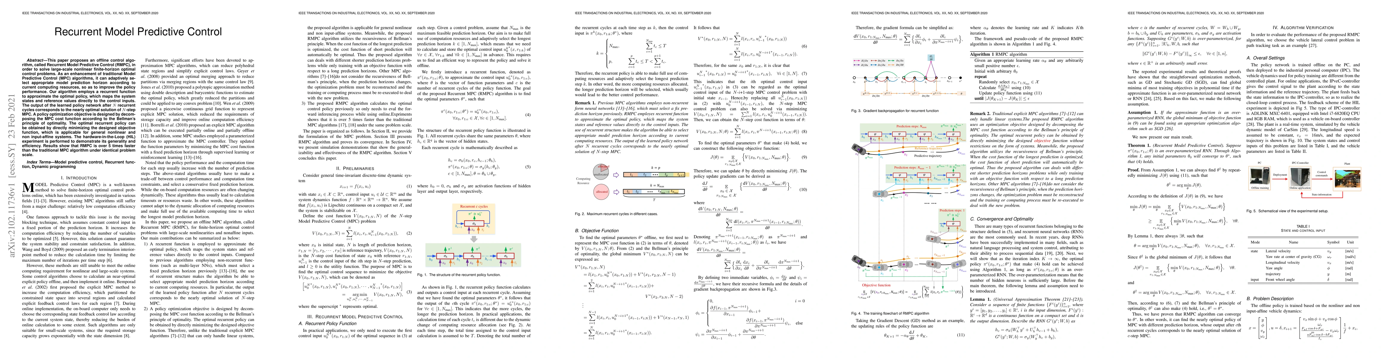 This paper introduces Recurrent Model Predictive Control (RMPC), an off-line algorithm for solving nonlinear optimal control problems by adaptively selecting the longest prediction horizon. It employs a recurrent function to approximate the optimal policy, demonstrating convergence and optimality through the Bellman principle and proving its efficiency via numerical examples.