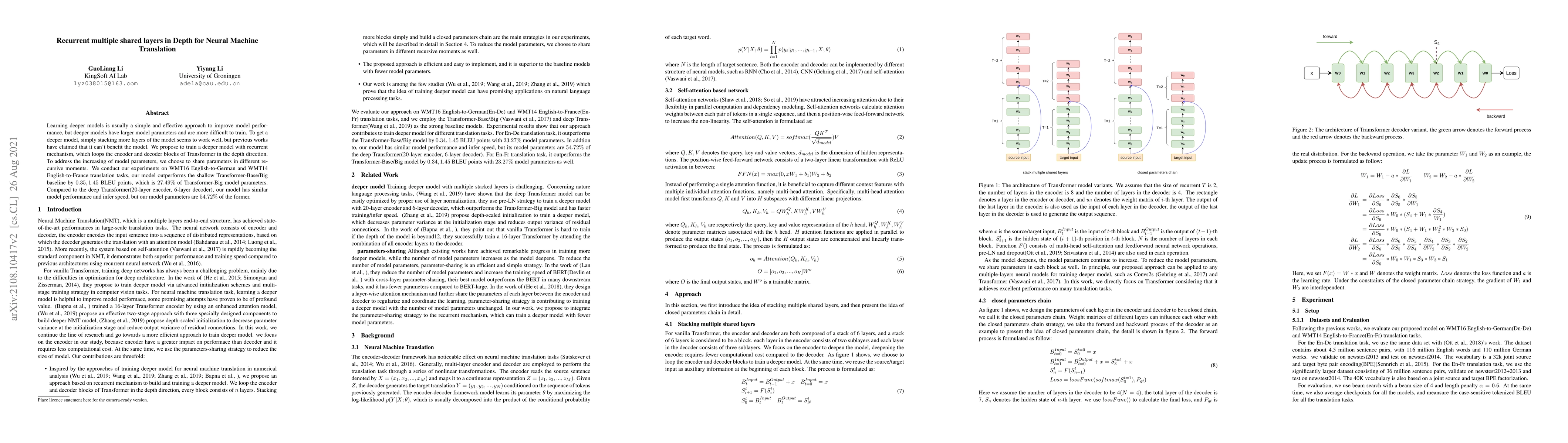 This paper proposes a deeper neural machine translation model using recurrent shared layers in a Transformer architecture, achieving better performance with fewer parameters compared to traditional deep models. Experiments on WMT datasets show significant improvements over baseline models.