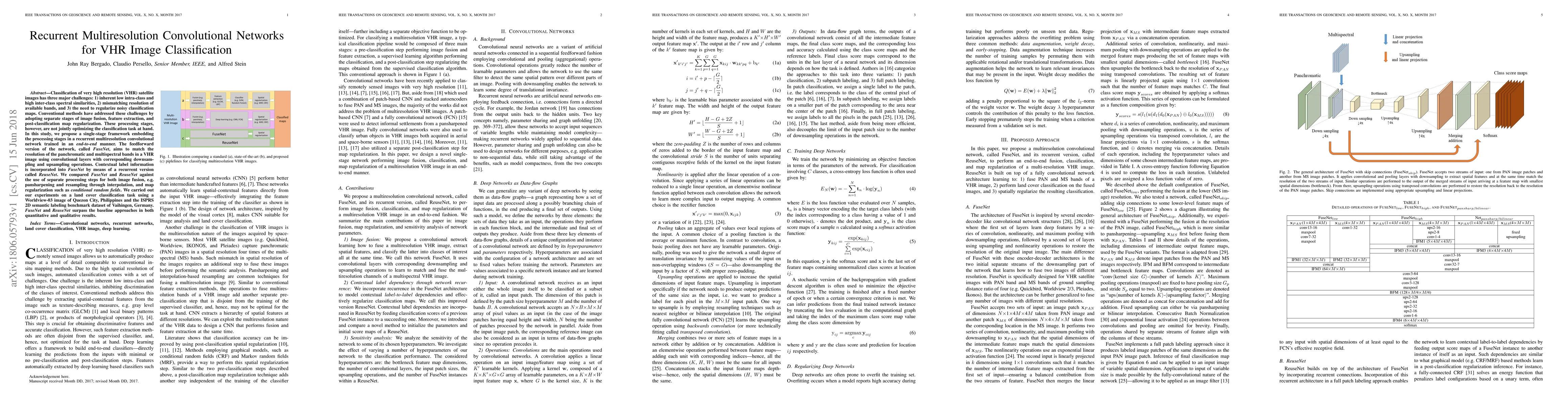 Classification of very high resolution (VHR) satellite images has three major challenges: 1) inherent low intra-class and high inter-class spectral similarities, 2) mismatching resolution of available bands, and 3) the need to regularize noisy classification maps. Conventional methods have addressed these challenges by adopting separate stages of image fusion, feature extraction, and post-classification map regularization. These processing stages, however, are not jointly optimizing the classification task at hand. In this study, we propose a single-stage framework embedding the processing stages in a recurrent multiresolution convolutional network trained in an end-to-end manner. The feedforward version of the network, called FuseNet, aims to match the resolution of the panchromatic and multispectral bands in a VHR image using convolutional layers with corresponding downsampling and upsampling operations. Contextual label information is incorporated into FuseNet by means of a recurrent version called ReuseNet. We compared FuseNet and ReuseNet against the use of separate processing steps for both image fusion, e.g. pansharpening and resampling through interpolation, and map regularization such as conditional random fields. We carried out our experiments on a land cover classification task using a Worldview-03 image of Quezon City, Philippines and the ISPRS 2D semantic labeling benchmark dataset of Vaihingen, Germany. FuseNet and ReuseNet surpass the baseline approaches in both quantitative and qualitative results.