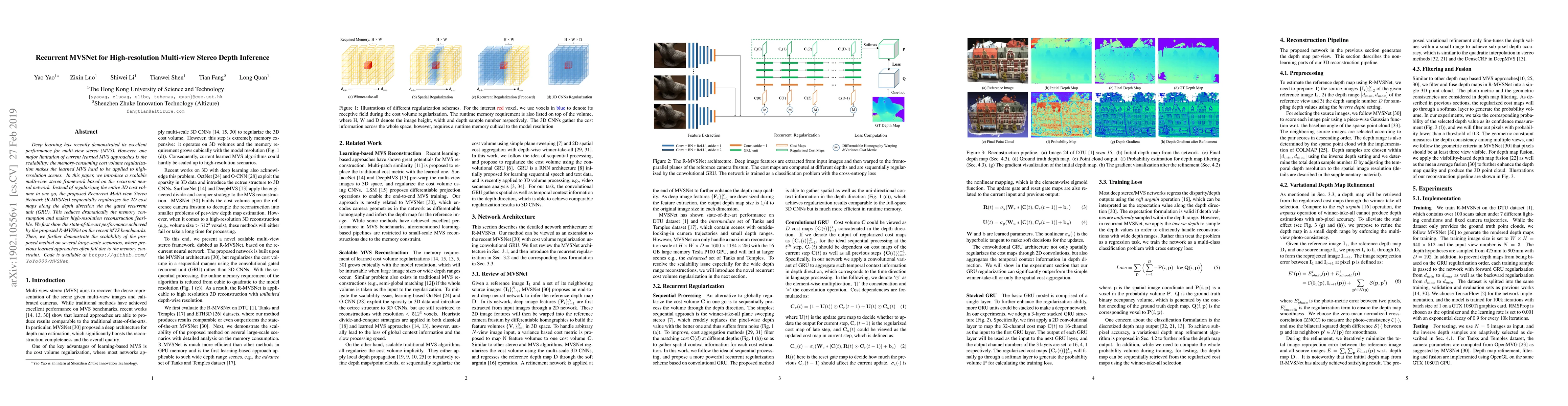 This paper introduces Recurrent MVSNet, a scalable deep learning framework for high-resolution multi-view stereo depth inference using recurrent neural networks. By sequentially regularizing 2D cost maps with gated recurrent units, it significantly reduces memory consumption, enabling feasible high-resolution reconstructions and outperforming previous methods on large-scale scenarios.