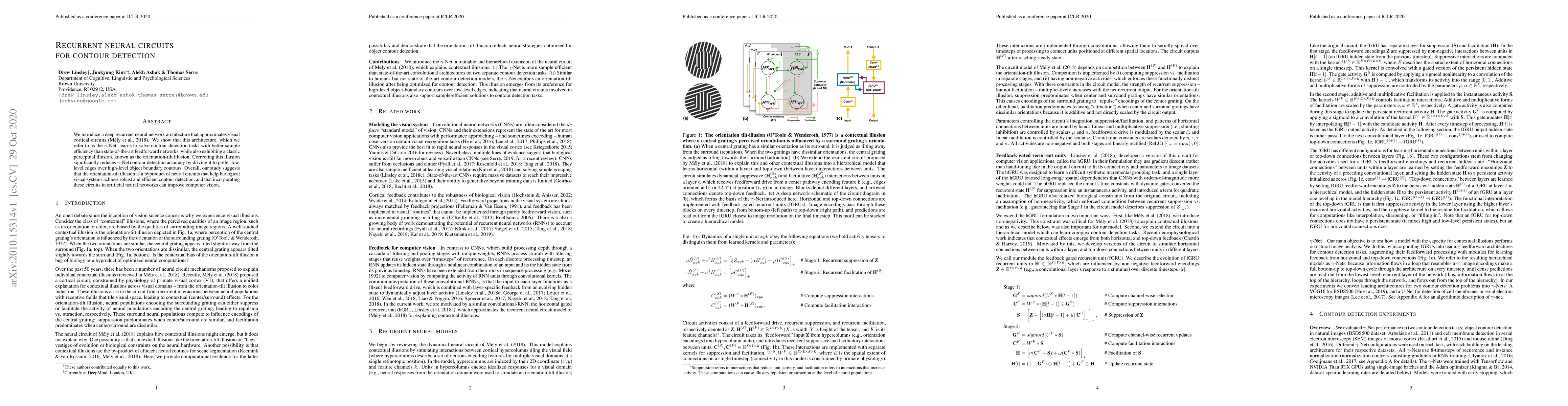 We introduce a deep recurrent neural network architecture that approximates visual cortical circuits. We show that this architecture, which we refer to as the gamma-net, learns to solve contour detection tasks with better sample efficiency than state-of-the-art feedforward networks, while also exhibiting a classic perceptual illusion, known as the orientation-tilt illusion. Correcting this illusion significantly reduces gamma-net contour detection accuracy by driving it to prefer low-level edges over high-level object boundary contours. Overall, our study suggests that the orientation-tilt illusion is a byproduct of neural circuits that help biological visual systems achieve robust and efficient contour detection, and that incorporating these circuits in artificial neural networks can improve computer vision.