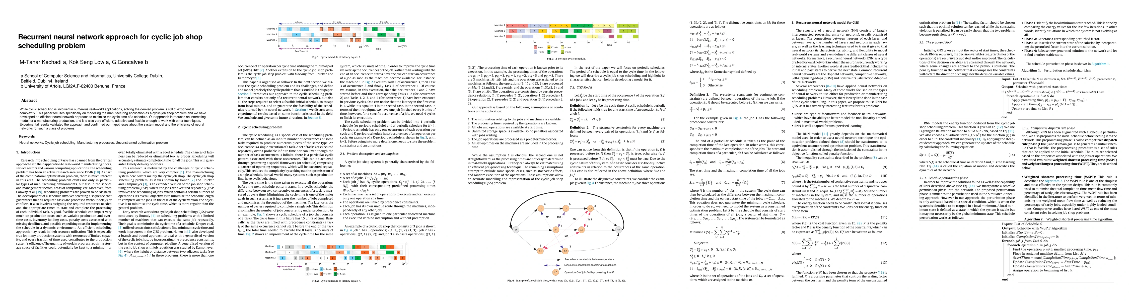 This paper proposes a recurrent neural network approach for solving the cyclic job shop scheduling problem, aiming to minimize cycle time efficiently. Experimental results demonstrate the model's effectiveness, adaptability, and efficiency in manufacturing applications.