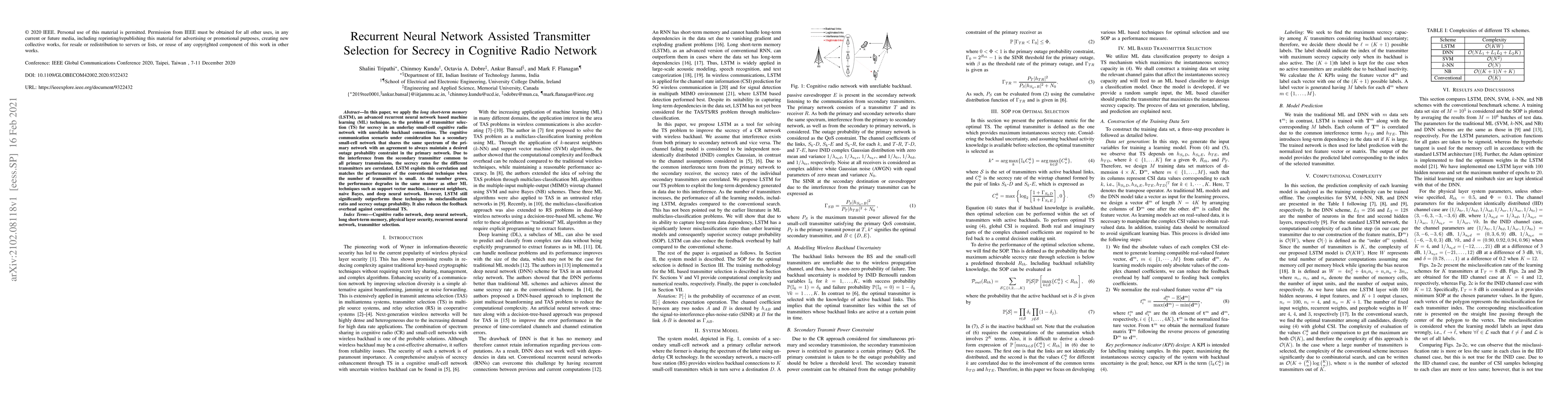 In this paper, we apply the long short-term memory (LSTM), an advanced recurrent neural network based machine learning (ML) technique, to the problem of transmitter selection (TS) for secrecy in an underlay small-cell cognitive radio network with unreliable backhaul connections. The cognitive communication scenario under consideration has a secondary small-cell network that shares the same spectrum of the primary network with an agreement to always maintain a desired outage probability constraint in the primary network. Due to the interference from the secondary transmitter common to all primary transmissions, the secrecy rates for the different transmitters are correlated. LSTM exploits this correlation and matches the performance of the conventional technique when the number of transmitters is small. As the number grows, the performance degrades in the same manner as other ML techniques such as support vector machine, $k$-nearest neighbors, naive Bayes, and deep neural network. However, LSTM still significantly outperforms these techniques in misclassification ratio and secrecy outage probability. It also reduces the feedback overhead against conventional TS.