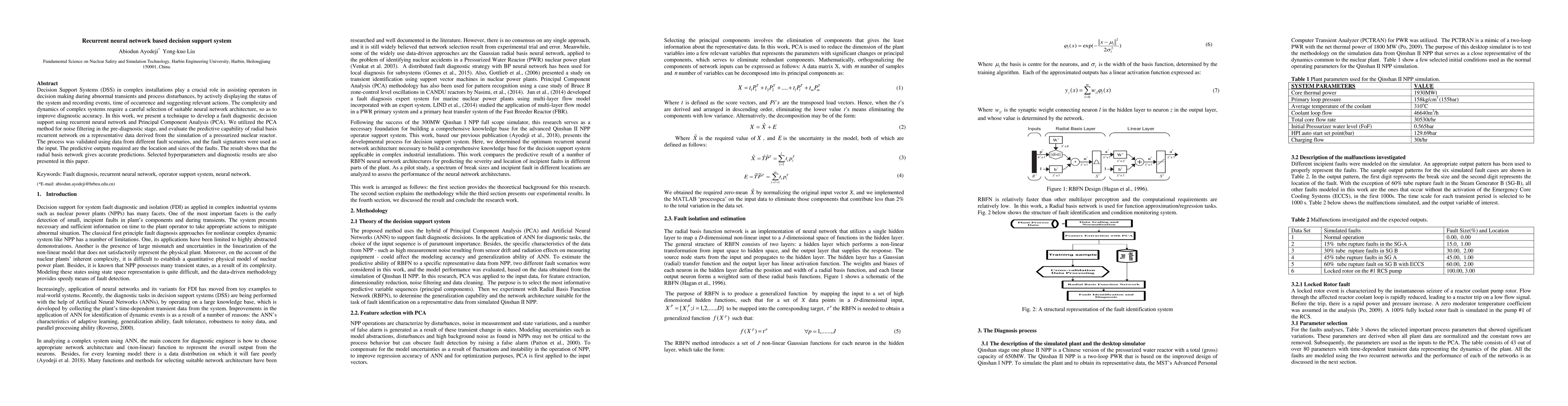 This paper develops a fault diagnostic decision support system using a recurrent neural network and Principal Component Analysis for noise filtering. The radial basis recurrent network shows accurate predictions of fault locations and sizes in simulated pressurized nuclear reactor scenarios.