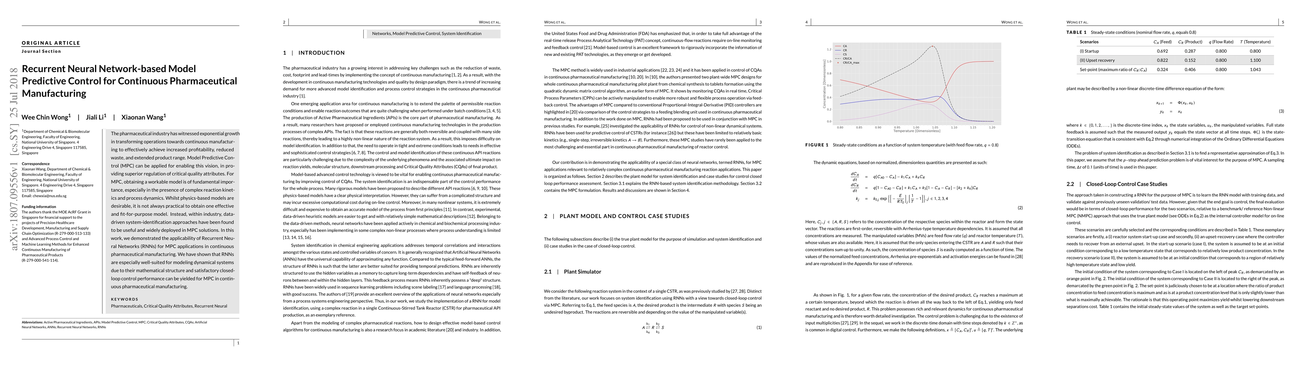 This paper explores the use of Recurrent Neural Networks (RNNs) for Model Predictive Control (MPC) in continuous pharmaceutical manufacturing, demonstrating their effectiveness in modeling complex reaction kinetics and achieving superior regulation of critical quality attributes. The study highlights RNNs' suitability for dynamical systems and their potential to deliver satisfactory closed-loop control performance.