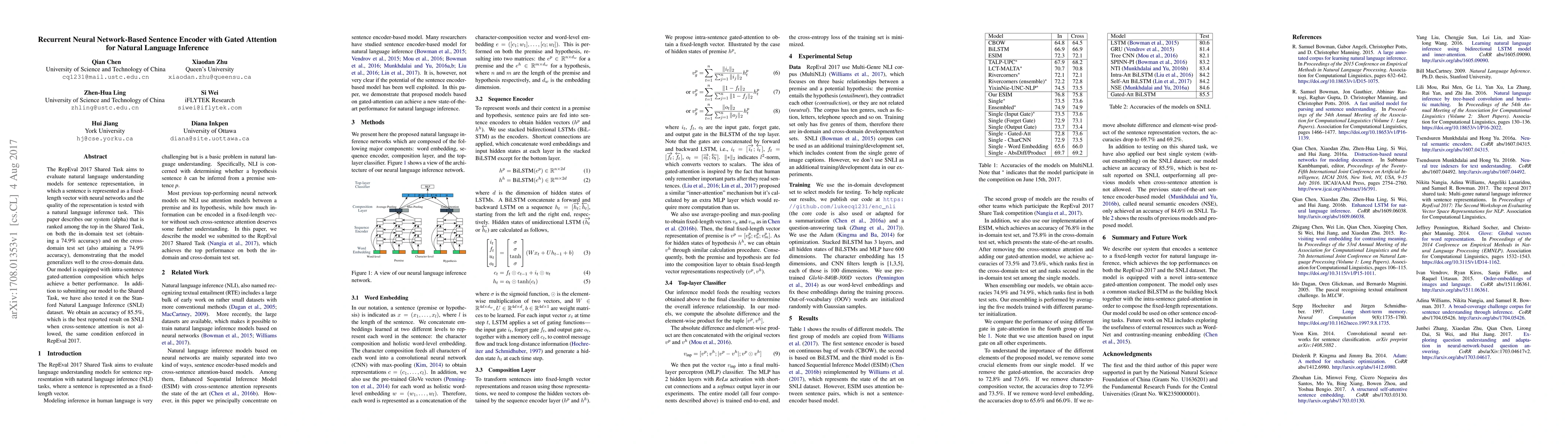 This paper presents a top-ranked recurrent neural network-based sentence encoder with gated attention for natural language inference, achieving 74.9% accuracy on both in-domain and cross-domain test sets in the RepEval 2017 Shared Task and 85.5% accuracy on the SNLI dataset. The gated attention mechanism enhances intra-sentence representation.
