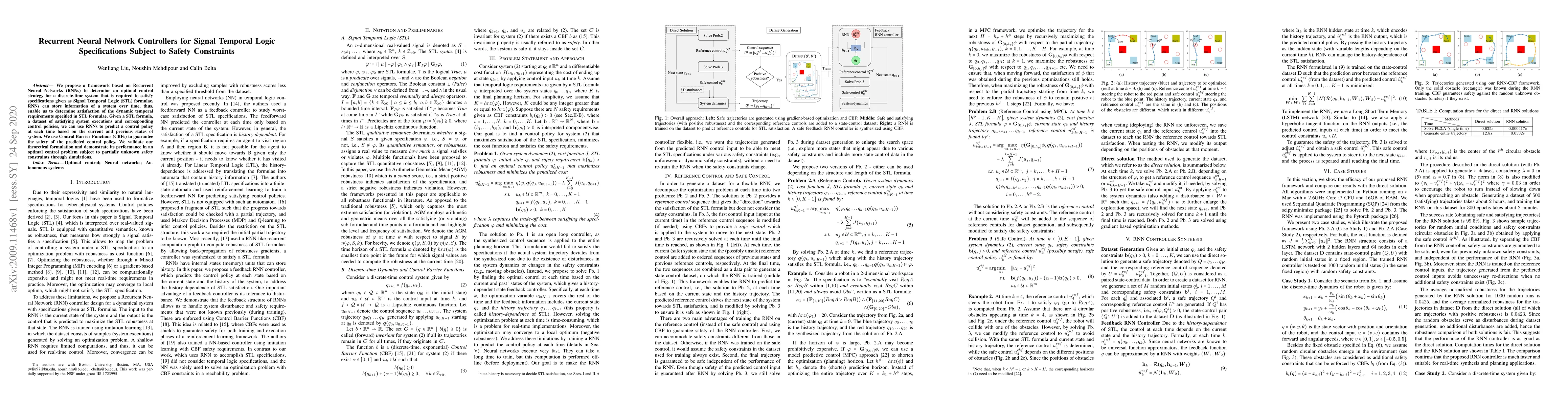 We propose a framework based on Recurrent Neural Networks (RNNs) to determine an optimal control strategy for a discrete-time system that is required to satisfy specifications given as Signal Temporal Logic (STL) formulae. RNNs can store information of a system over time, thus, enable us to determine satisfaction of the dynamic temporal requirements specified in STL formulae. Given a STL formula, a dataset of satisfying system executions and corresponding control policies, we can use RNNs to predict a control policy at each time based on the current and previous states of system. We use Control Barrier Functions (CBFs) to guarantee the safety of the predicted control policy. We validate our theoretical formulation and demonstrate its performance in an optimal control problem subject to partially unknown safety constraints through simulations.