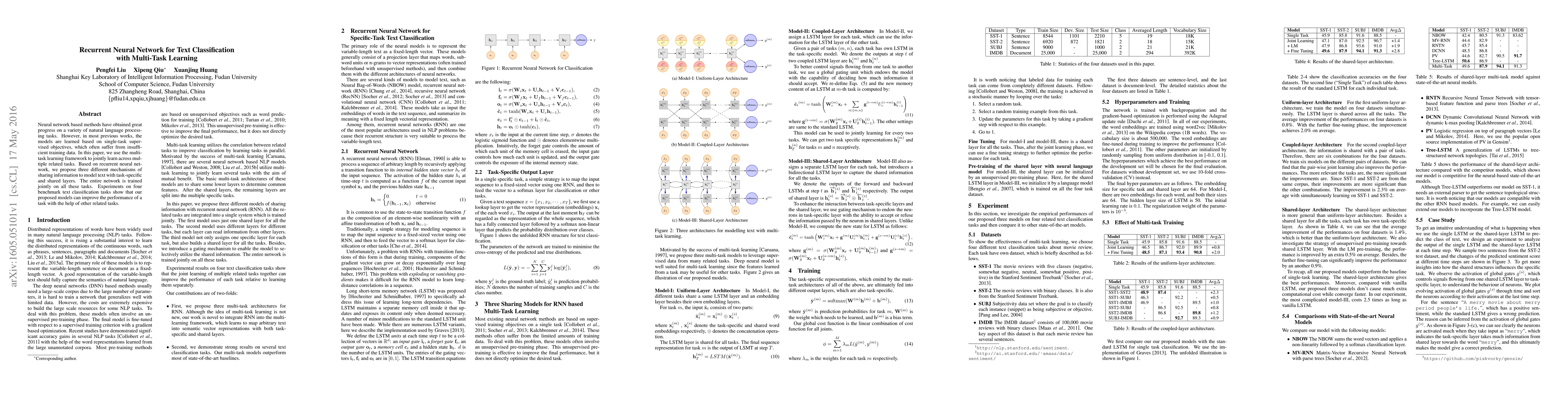 This paper proposes a recurrent neural network (RNN) for text classification using multi-task learning to jointly optimize across multiple related tasks. The model shares information through task-specific and shared layers, improving performance by leveraging related tasks, as demonstrated by better results on four benchmark datasets.
