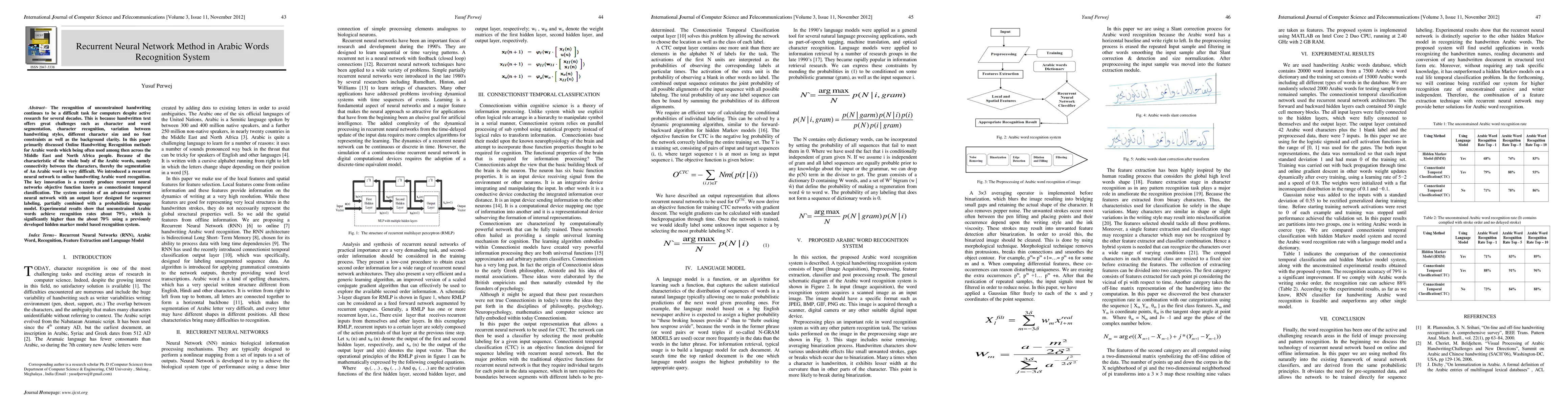 The recognition of unconstrained handwriting continues to be a difficult task for computers despite active research for several decades. This is because handwritten text offers great challenges such as character and word segmentation, character recognition, variation between handwriting styles, different character size and no font constraints as well as the background clarity. In this paper primarily discussed Online Handwriting Recognition methods for Arabic words which being often used among then across the Middle East and North Africa people. Because of the characteristic of the whole body of the Arabic words, namely connectivity between the characters, thereby the segmentation of An Arabic word is very difficult. We introduced a recurrent neural network to online handwriting Arabic word recognition. The key innovation is a recently produce recurrent neural networks objective function known as connectionist temporal classification. The system consists of an advanced recurrent neural network with an output layer designed for sequence labeling, partially combined with a probabilistic language model. Experimental results show that unconstrained Arabic words achieve recognition rates about 79%, which is significantly higher than the about 70% using a previously developed hidden markov model based recognition system.