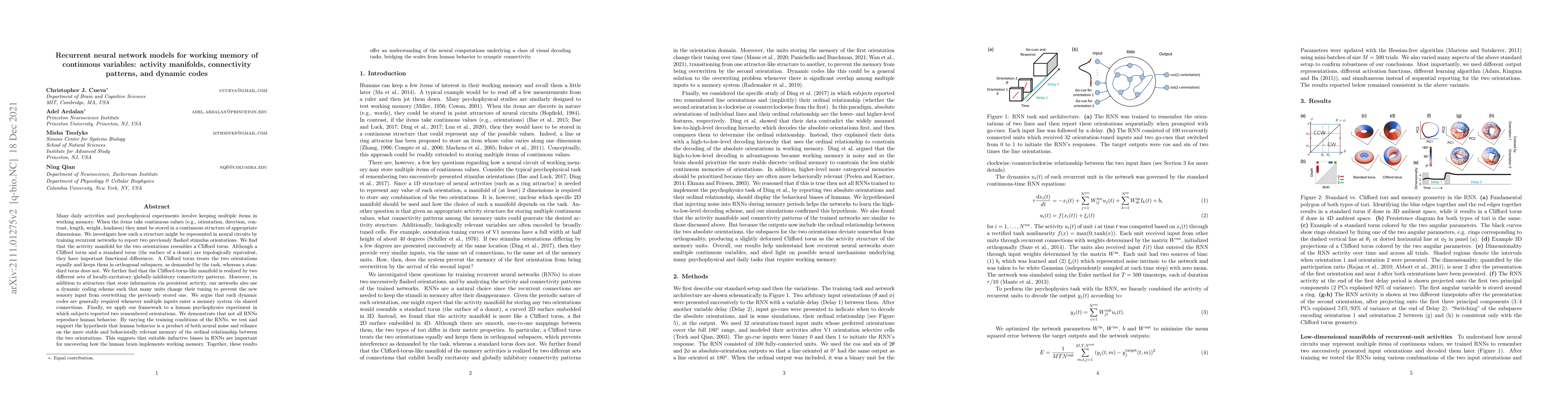 This research uses recurrent neural networks to model human working memory for continuous variables, discovering a Clifford torus activity representation that equally treats and orthogonally stores two orientations. The study also identifies dynamic coding methods to prevent sensory input overwriting stored information, applicable to shared-connection memory systems. The findings suggest that these neural computations underlie visual decoding tasks and offer insights into human brain working memory implementation.