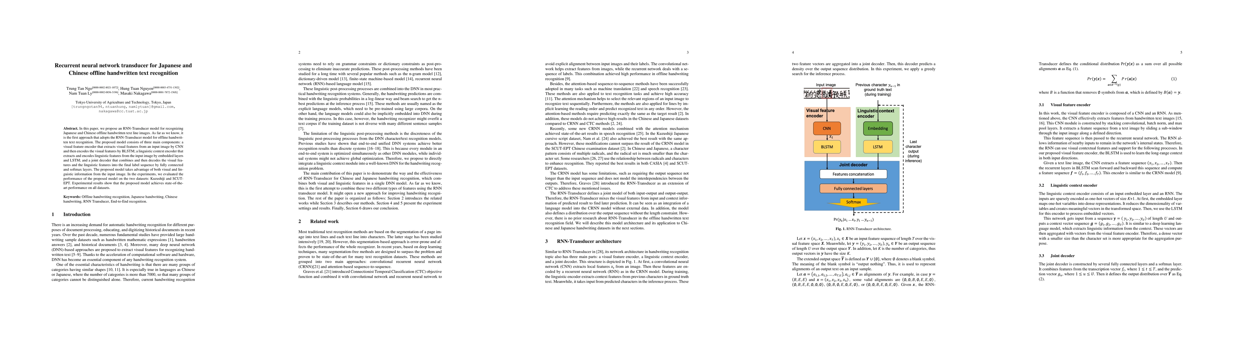 This paper introduces an RNN-Transducer model for recognizing offline handwritten Japanese and Chinese text, achieving state-of-the-art performance on Kuzushiji and SCUT-EPT datasets by leveraging both visual and linguistic features.