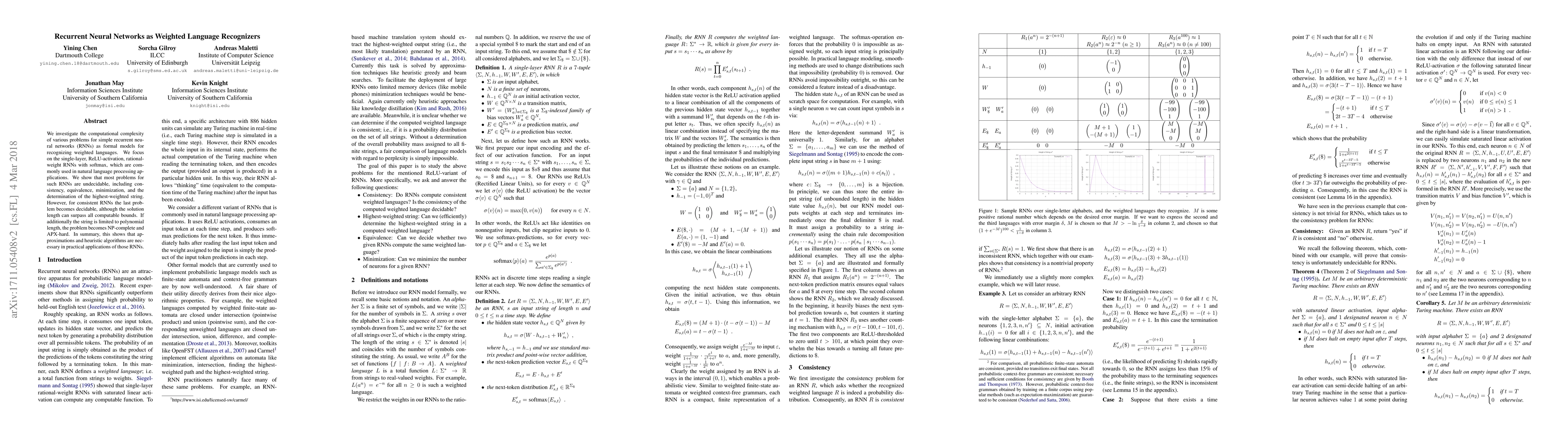This paper explores the computational complexity of recurrent neural networks (RNNs) as models for weighted language recognition, finding most problems undecidable, except for consistent RNNs where the highest-weighted string determination becomes decidable but computationally intractable. Practical applications thus require approximations and heuristic algorithms.