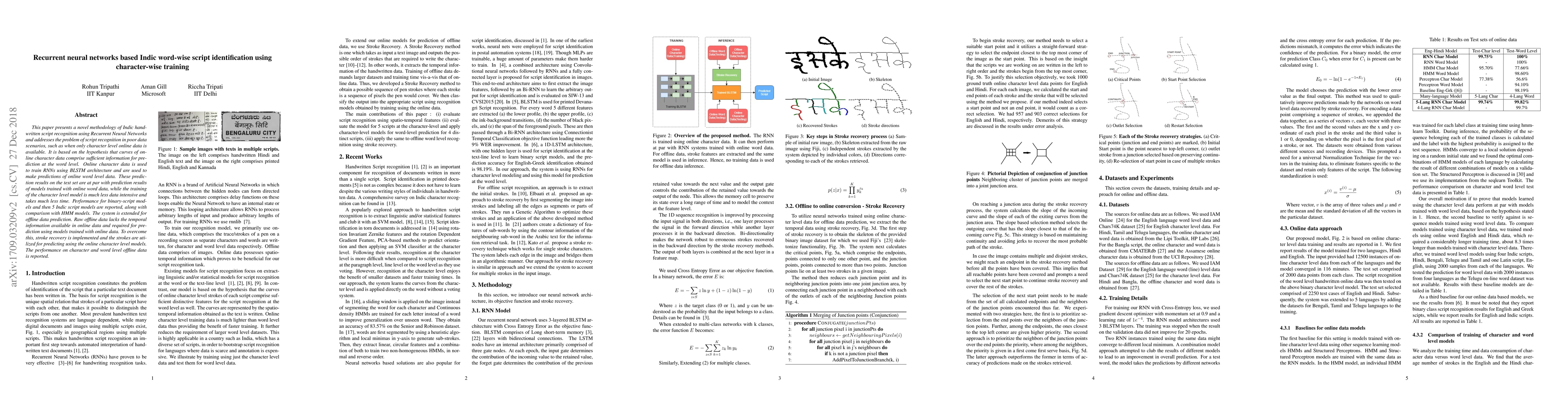 This paper introduces a Recurrent Neural Network (RNN) approach for Indic script identification using character-level training, demonstrating effective word-level prediction. It employs BLSTM architecture trained on online character data, achieving performance comparable to models trained on word-level data, with significantly less data and training time.