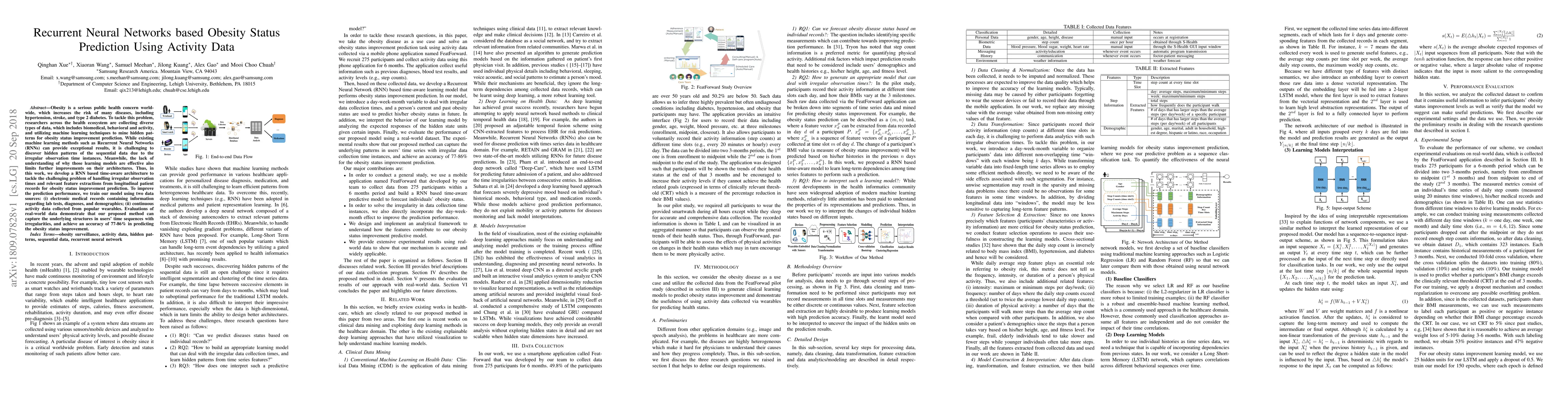 This paper proposes a Recurrent Neural Network (RNN) based time-aware architecture to predict obesity status improvement using irregular activity data from wearables and electronic medical records. The model achieves an accuracy of 77-86% by effectively handling irregular observation times and extracting relevant features.