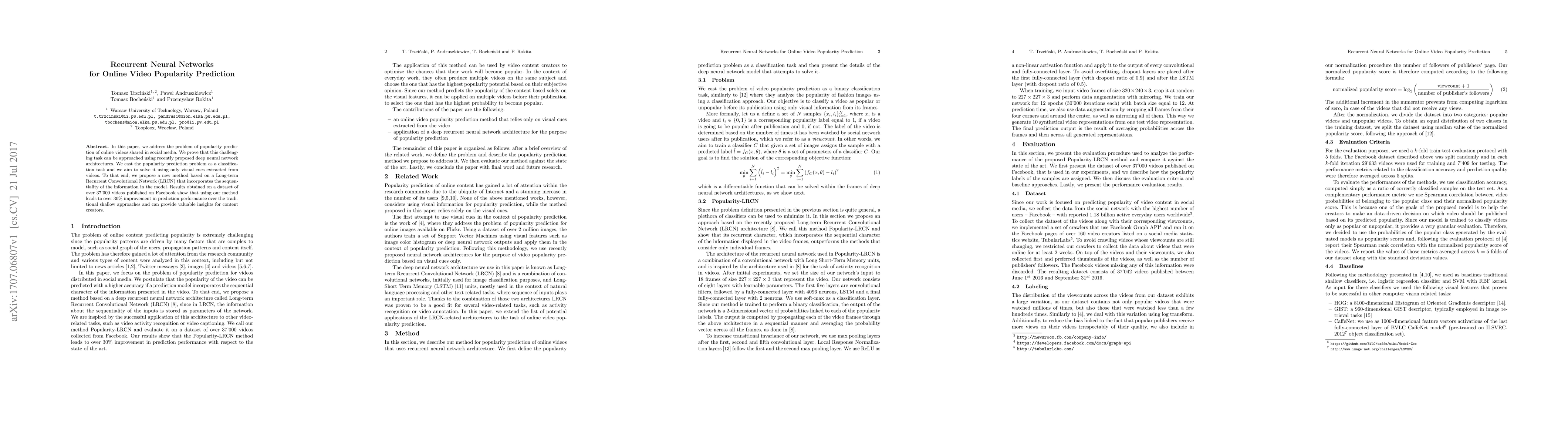 This paper proposes a Long-term Recurrent Convolutional Network (LRCN) to predict online video popularity based solely on visual cues. The method shows a 30% improvement over traditional shallow approaches, offering valuable insights for content creators.