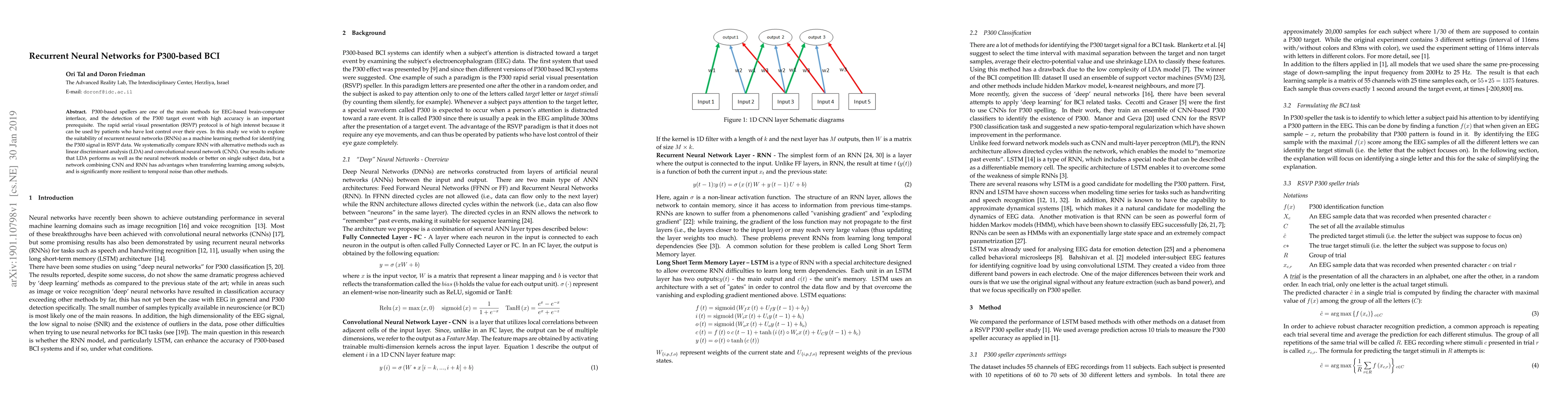 This study investigates recurrent neural networks (RNNs) for detecting P300 signals in EEG data from RSVP protocols, comparing them to linear discriminant analysis (LDA) and convolutional neural networks (CNN). While LDA performs well on single-subject data, a combined CNN-RNN model shows better transfer learning and noise resilience across subjects.